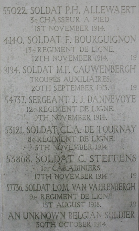 Localisation - Situering: Welford Road Cemetery, entre Welford Road et University Road. Welford Road Cemetery, tussen Welford Road en University Road. Coordonnées GPS - GPS-coördinaten: +52°37'18.98", -1°07'41.36" Inscriptions - Opschriften Monument - Monument "[Huit noms, parmi lesquels un inconnu, classés par ordre alphabétique, avec mention du régiment et de la date de décès - Acht namen, onder wie een onbekende, alfabetisch gerangschikt, met vermelding van regiment en overlijdensdatum]" Tombe commune - Gemeenschappelijk graf "IN REMEMBRANCE OF THE HEROIC BELGIAN SOLDIERS [Huit noms, parmi lesquels un inconnu, classés par ordre alphabétique - Acht namen, onder wie een onbekende, alfabetisch gerangschikt] AND THE BELGIAN REFUGEES WHO PASSED AWAY IN THIS TOWN AND COUNTY DURING THE GREAT EUROPEAN WAR" Voir les noms des Belges mentionnés sur ces monuments - Zie namen van de Belgen vermeld op deze monumenten |