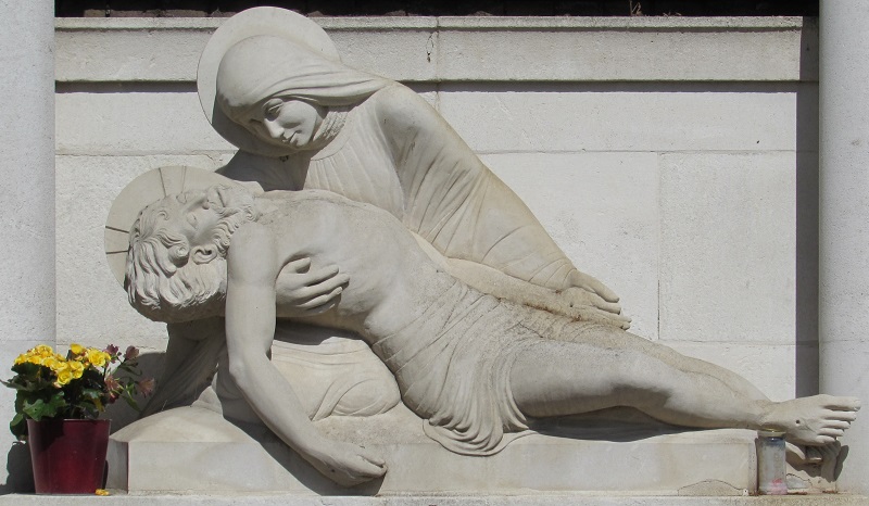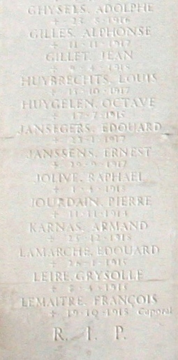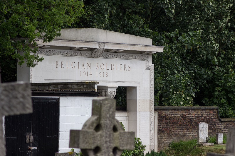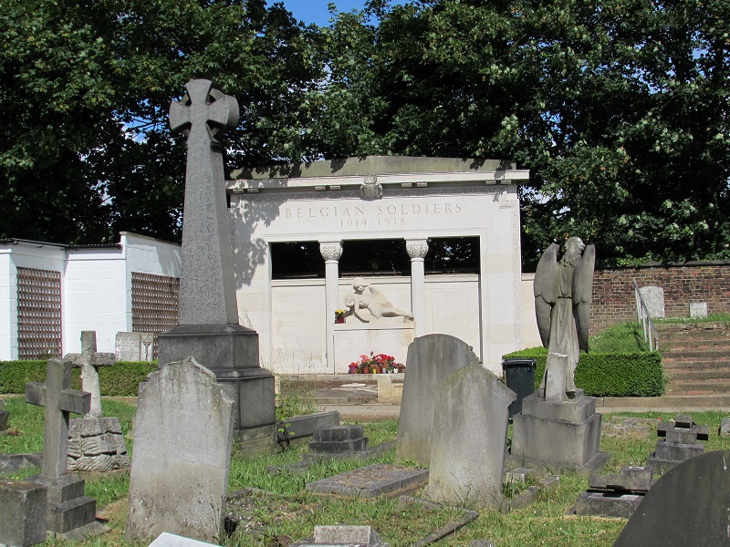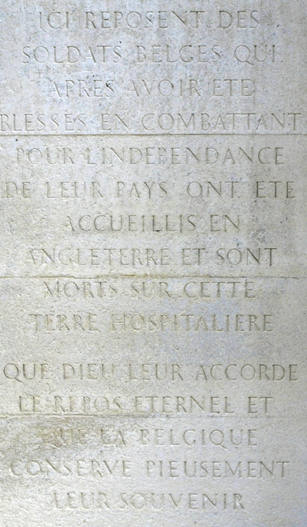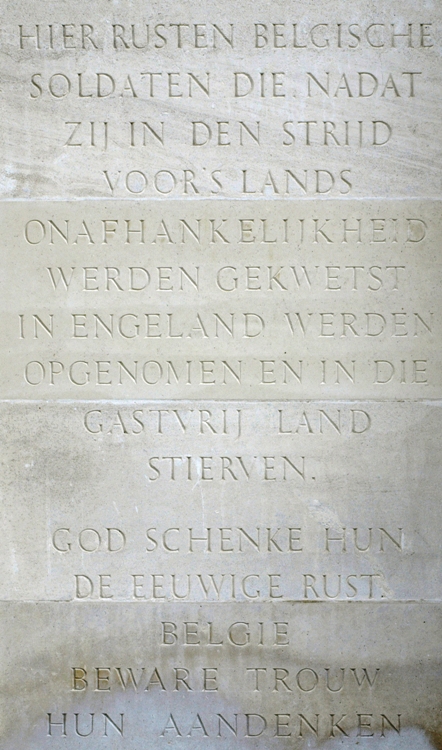 Localisation - Ligging: Saint Mary's Roman Catholic Cemetery (Cimetière catholique romain de Saint Mary - Rooms-katholieke begraafplaats St.Mary), Harrow Road, Kensal Green, London NW10 5NU. Coordonnées GPS - GPS-coördinaten: +51°31'44.6", -0°13'57.1" Description - Beschrijving Septante-sept Belges reposent dans cette tombe commune. Zevenenzeventig Belgen rusten in deze gemeenschappelijke graf. Inscriptions - Opschriften "BELGIAN SOLDIERS 1914 - 1918" "GREATER LOVE THAN THIS NO MAN HATH. THAT A MAN LAY DOWN HIS LIFE FOR HIS FRIENDS S. JOHN XV.13" [Traduction: Il n'est pas de plus grand amour que de donner sa vie pour ceux qu'on aime] [Vertaling: Er is geen grotere liefde dan je leven te geven voor je vrienden] "HIER RUSTEN BELGISCHE SOLDATEN DIE NADAT ZIJ IN DEN STRIJD VOOR'S LANDS ONAFHANKELIJKHEID WERDEN GEKWETST IN ENGELAND WERDEN OPGENOMEN EN IN DIE GASTVRIJ LAND STIERVEN. GOD SCHENKE HUN DE EEUWIGE RUST. BELGIE BEWARE TROUW HUN AANDENKEN." "ICI REPOSENT DES SOLDATS BELGES QUI APRÈS AVOIR ÉTÉ BLESSÉS EN COMBATTANT POUR L'INDÉPENDANCE DE LEUR PAYS ONT ÉTÉ ACCUEILLIS EN ANGLETERRE ET SONT MORTS SUR CETTE TERRE HOSPITALIÈRE QUE DIEU LEUR ACCORDE LE REPOS ÉTERNEL, ET QUE LA BELGIQUE CONSERVE PIEUSEMENT LEUR SOUVENIR." "À NOUS LE SOUVENIR À EUX L'IMMORTALITÉ ŒUVRE NATIONALE LE SOUVENIR BELGE 1914 - 1918" "[Septante-sept noms, classés par ordre alphabétique, avec mention de la date de décès - Zevenenzeventig namen, alfabetisch gerangschikt, met vermelding van overlijdensdatum]" Voir les noms gravés sur ce monument - Zie namen gebeiteld op het monument |
