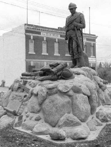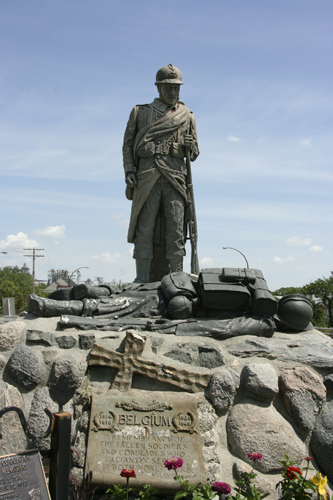 Localisation - Situering: "King ALBERT Place" (Place du Roi Albert, Koning Albert plaats), Provencher Boulevard, Saint-Boniface (Winnipeg), Province de / Provincie Manitoba. Coordonnées GPS - GPS-coördinaten: +49° 53' 41.17", -97° 6' 41.12". Inscriptions - Opschriften Côté ouest - Westkant "1914 - 1918 BELGIUM 1939 - 1945 IN REMEMBRANCE OF THE FALLEN SOLDIERS AND COMRADES WHO VALIANTLY SERVED IN BOTH WORLD WARS H. GARNIER, SCULPTOR" Côté sud - Zuidkant "BELGIQUE 1914 - 1918 1939 - 1945 1950 - 1953" Côté nord - Noordkant "BELGIË 1914 - 1918" Côté est - Oostkant "H. GARNIER 1938" Inauguration - Inhuldiging: 1er octobre 1938 - 1 oktober 1938. Sculpteur/Beeldhouwer: Hubert GARNIER. D'après un article de David O'BRIEN publié dans le Winnipeg Free Press du 7 novembre 2009, ce monument est unique au Canada car il s'agit du seul monument représentant un soldat mort, le visage enfoui dans la boue. Pour plus d'informations concernant ce monument et son histoire - Voor meer info over deze monument en zijn geschiedenis: "Boulevard Provencher - Belgian War Memorial" Ce monument ne comporte pas de noms - Er staan geen namen op deze monument |