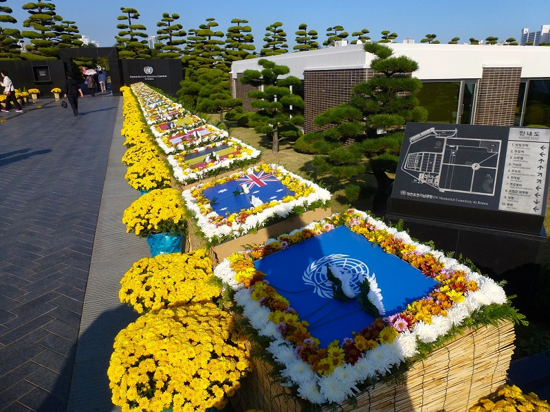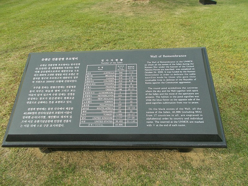 Localisation - Ligging: United Nations Memorial Cemetery in Korea, 93, UN pyeonghwa-ro, Nam-gu, Busan. Coordonnées GPS - GPS-coördinaten: +35°07'38.5", +129°05'54.2" Inscriptions - Opschriften "BELGIUM [Cent-et-six noms, classés par ordre alphabétique - Honderd en zes namen, alfabetisch gerangschikt]" Informations complémentaires - Verdere informatie Site "Bérets bruns en Corée: la guerre oubliée" Site "Bruine mutsen in Korea: de vergeten oorlog" Voir les noms mentionnés sur la plaque commémorative - Zie namen vermeld op de gedenkplaat |