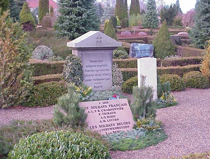 Localisation - Situering: Viborg Kirkegård, Gl. Skivevej. Cimetière de Viborg, Gl. Skivevej. Begraafplaats van Viborg, Gl. Skivevej. Coordonnées GPS - GPS-coördinaten: +56°27'21.75", +9°24'34.32". Inscriptions sur les monuments - Opschriften op de monumenten Monument - Monument "MINDE OVER BELGISKE, ENGELSKE, FRANSKE OG RUSSISKE SOLDATER, DÖDE I VIBORG UNDER VERDENSKRIGEN REJST AF VENNER I JYLLAND" Plaque commémorative - Gedenksteen "† 1919 LES SOLDATS FRANÇAIS [Quatre noms, non classés par ordre alphabétique - Vier namen, niet alfabetisch gerangschikt] LES SOLDATS BELGES [Deux noms, non classés par ordre alphabétique - Vier namen, niet alfabetisch gerangschikt]" Traduction - Vertaling Monument - Monument En souvenir des soldats belges, anglais, français et russes, décédés à Viborg pendant la Guerre mondiale. Érigé par l'association "Venner i Jylland" (Les amis de la région du Jylland). Aandenken aan de Belgische, Engelsche, Franse en Russische soldaten overleden in Viborg tijdens de Wereldoorlog. Opgericht door "Venner i Jylland" (Vrienden uit Jylland). De plus, on trouve, à côté de ces deux monuments, un monument russe et deux tombes de soldats britanniques: W.T. BATE, mort le 15 décembre 1918 et H.E. DAVIS, mort le 24 août 1945. Dicht bij deze monumenten vindt men ook een Russisch monument en graven van twee Britse soldaten: W.T. BATE, overleden op 15 december 1918 en H.E. DAVIS, overleden op 24 augustus 1945. Mange tak til Kristian BUHL TOMSEN fra Aarhus Universitet for hjælpen. Voir les noms des soldats belges et français gravés sur ce monument - Zie namen van de Belgische en Franse soldaten vermeld op het monument |