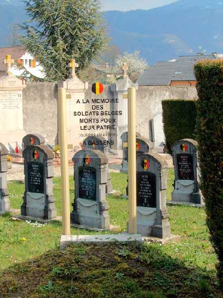 Localisation - Ligging: Cimetière communal, carré militaire belge, avenue de la République . Gemeentelijke begraafplaats, Belgisch militair ereperk, avenue de la République. Coordonnées GPS - GPS-coördinaten: +44°53'53.1", -0°31'05.4" Inscriptions - Opschriften "À LA MÉMOIRE DES SOLDATS BELGES MORTS POUR LEUR PATRIE (GUERRE 1914 - 1918) À BASSENS" Histoire - Geschiedenis Pour plus d'informations concernant les Belges ayant séjourné à Bassens, on se reportera au site "Médecins de la Grande Guerre" (http://www.1914-1918.be/). Voor bijkomende informatie betreffende de Belgen die tijdens de eerste wereldoorlog in Bassens verbleven, raadpleeg de site "Médecins de la Grande Guerre" (http://www.1914-1918.be/). Voir les noms mentionnés sur les tombes - Zie namen op de graven |