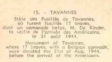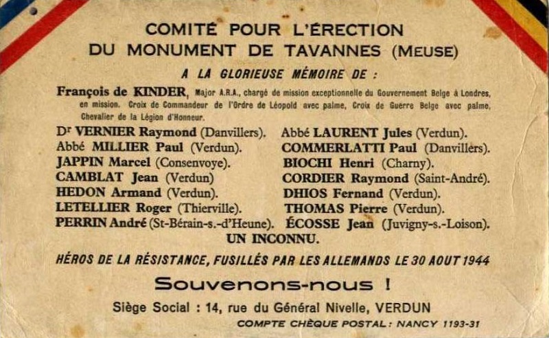 Localisation - Ligging: Route nationale 913a. Coordonnées GPS - GPS-coördinaten: +49°11'20.3", +5°27'36.6" Inscriptions sur le monument - Opschriften op het gedenkteken Monument "AUX HEROS DE LA RÉSISTANCE CONNUS INCONNUS ICI QUINZE FRANÇAIS ET UN BELGE VOLONTAIRES DE LA RÉSISTANCE TOMBÈRENT EN HÉROS À L'AUBE DU 31 AOÛT 1944 FUSILLÉS PAR LA GESTAPO À LEUR IMMORTELLE MÉMOIRE LA VILLE DE VERDUN [Seize noms, dont un Belge, François DE KINDER, et un inconnu. Zestien namen, waaronder één Belg, François DE KINDER, en één onbekende]" Plaque à l'avant du monument - Gedenkplaat vooraan het monument "CHARNIER OÙ FURENT TROUVÉS EN DÉCEMBRE 44 LES CORPS MUTILÉS DE 16 PATRIOTES RÉSISTANTS MASSACRÉS PAR LES ALLEMANDS" Stèle commémorative - Gedenksteen "ICI QUINZE FRANÇAIS ET UN BELGE VOLONTAIRES DE LA RÉSISTANCE TOMBÈRENT EN HÉROS À L'AUBE DU 31 AOÛT 1944 FUSILLÉS PAR LA GESTAPO À LEUR IMMORTELLE MÉMOIRE LA VILLE DE VERDUN [Seize noms, dont un Belge, François DE KINDER, et un inconnu. Zestien namen, waaronder één Belg, François DE KINDER, en één onbekende]" Remarque - Opmerking: Nous ignorons si cette stèle commémorative existe toujours. Het is onbekend of deze gedenkplaat nog bestaat. Contexte historique - Historisch achtergrond Ce monument représente le charnier où furent retrouvés, en 22 décembre 1944 à l'entrée sud du tunnel de Tavennes , les corps mutilés de 16 patriotes résistants, massacrés par la Gestapo. Parmi ces corps, se trouvaient 15 Français, 1 Belge et un inconnu. Une plaque porte les noms de ces hommes courageux qui tombèrent en héros, face aux Allemands. Ces hommes courageux furent tués à l'aube du 31 août 1944. Plus d'informations concernant cette personne - Bijkomende informatie over deze persoon |