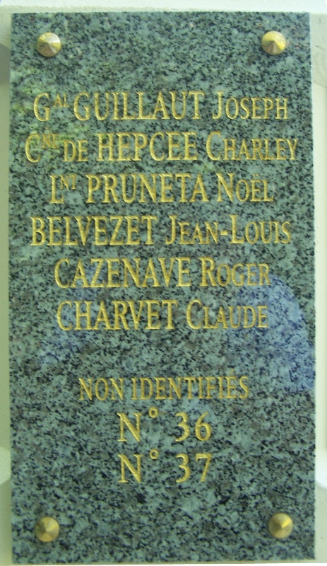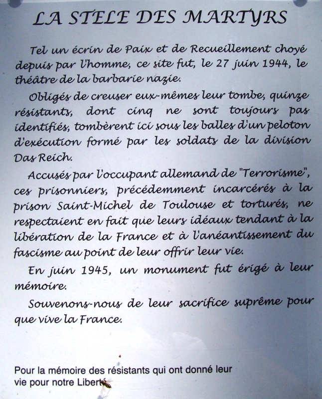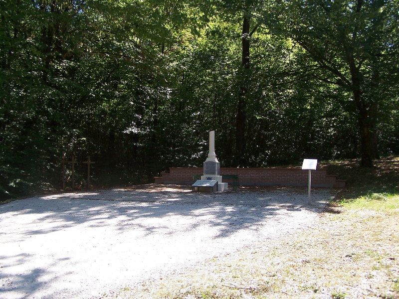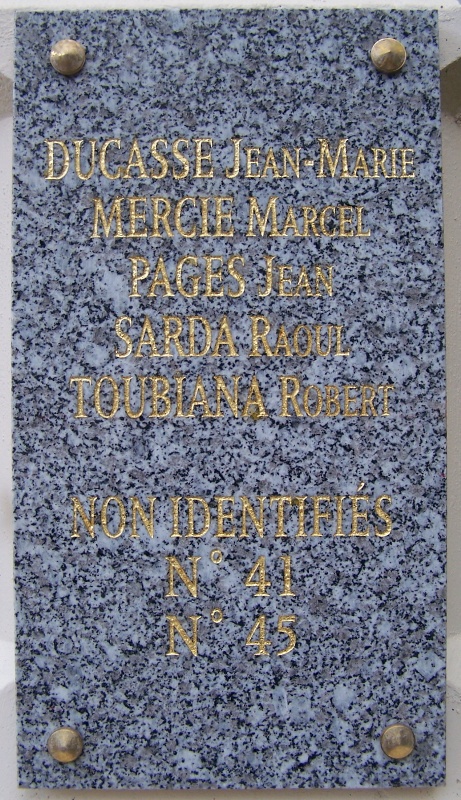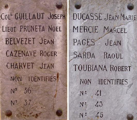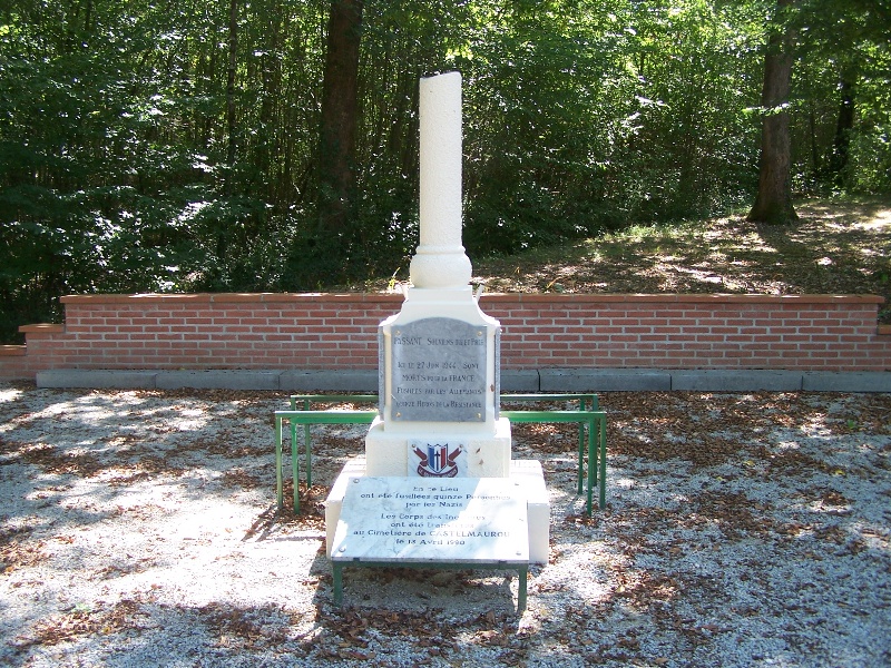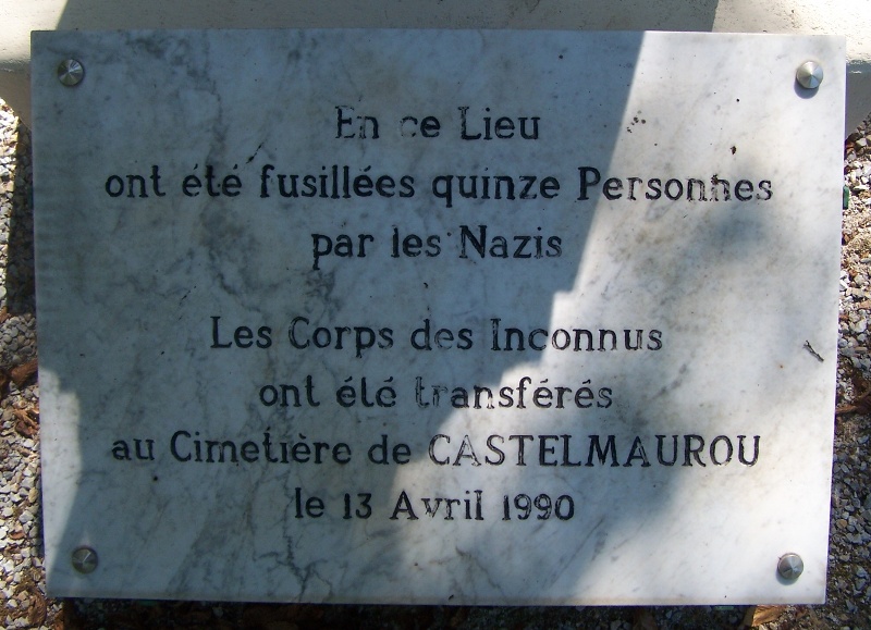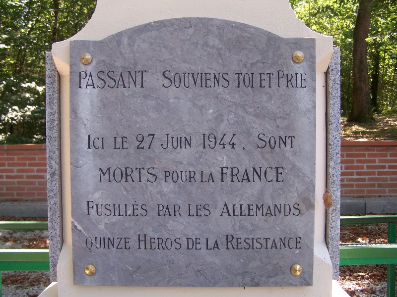 Localisation - Ligging: À l'intérieur du bois de la Reule, chemin des fusillés du bois de la Reule. In het "bois de la Reule", chemin des fusillés du bois de la Reule. Coordonnées GPS - GPS-coördinaten: +43°40'09.15", +1°33'40.26" Inscriptions sur le monument - Opschriften op het monument Face avant - Voorkant "PASSANT SOUVIENS-TOI ET PRIE ICI LE 27 JUIN 1944, SONT MORTS POUR LA FRANCE FUSILLÉS PAR LES ALLEMANDS QUINZE HÉROS DE LA RÉSISTANCE" "EN CE LIEU ONT ÉTÉ FUSILLÉES QUINZE PERSONNES PAR LES NAZIS LES CORPS DES INCONNUS ONT ÉTÉ TRANSFÉRÉS AU CIMETIÈRE DE CASTELMAUROU LE 31 AVRIL 1990" Face latérale gauche - Linkerkant "[Six noms, classés par grade pour les trois premiers, ensuite par ordre alphabétique] NON IDENTIFIÉS N° 36 N° 37" Face latérale droite - Rechterkant "[Cinq noms, classés par ordre alphabétique] NON IDENTIFIÉS N° 41 N° 45" Beschrijving - Description: Un Belge, Charles DE HEPCÉE, est mentionné sur ce monument. Één Belg, Charles DE HEPCÉE, wordt vermeld op deze gedenkteken. Plus d'informations concernant Charles DE HEPCÉE; en ce qui concerne les victimes françaises mentionnées sur ce monument, on se reportera au site "Mémorial-Genweb". Bijkomende informatie over Charles DE HEPCÉE, betreffende de Franse slachtoffers, raadpleeg "Mémorial-Genweb" |