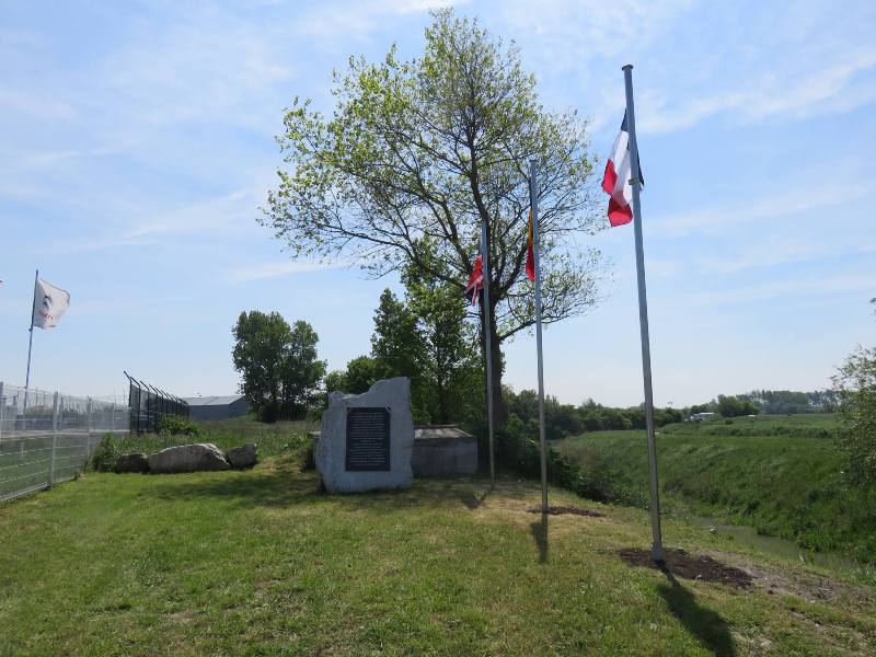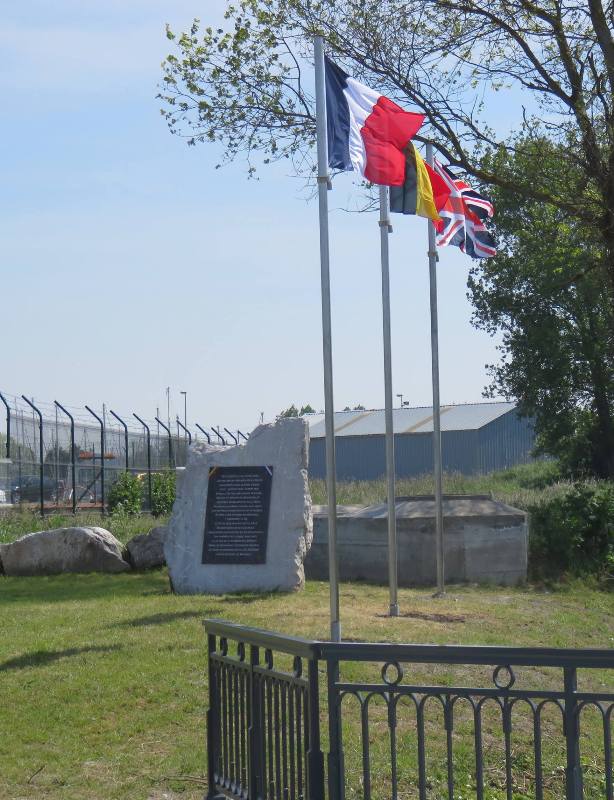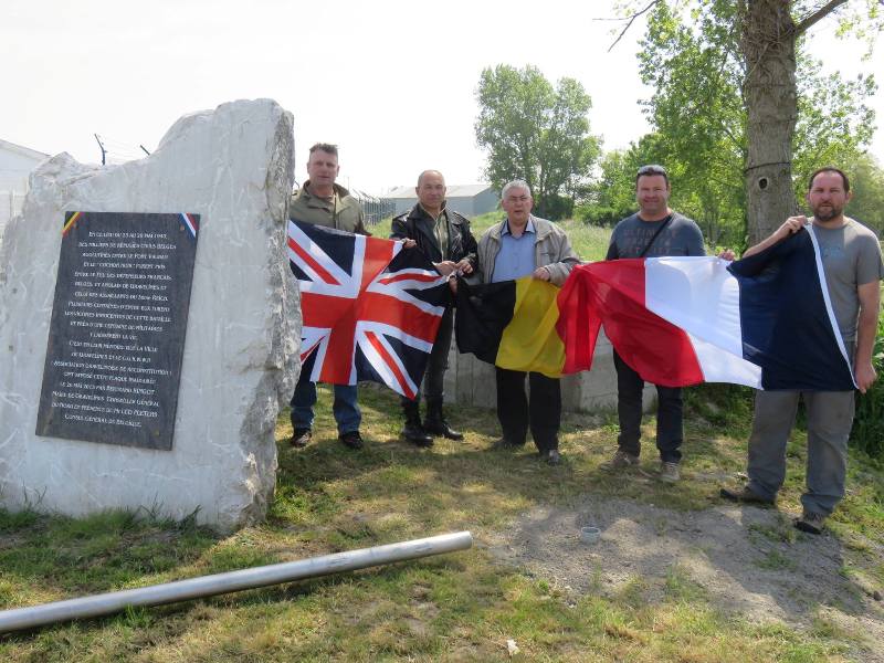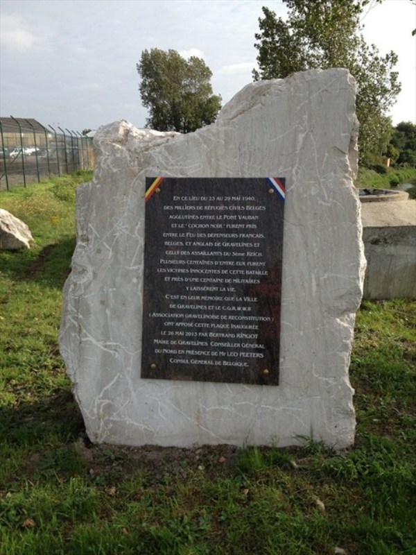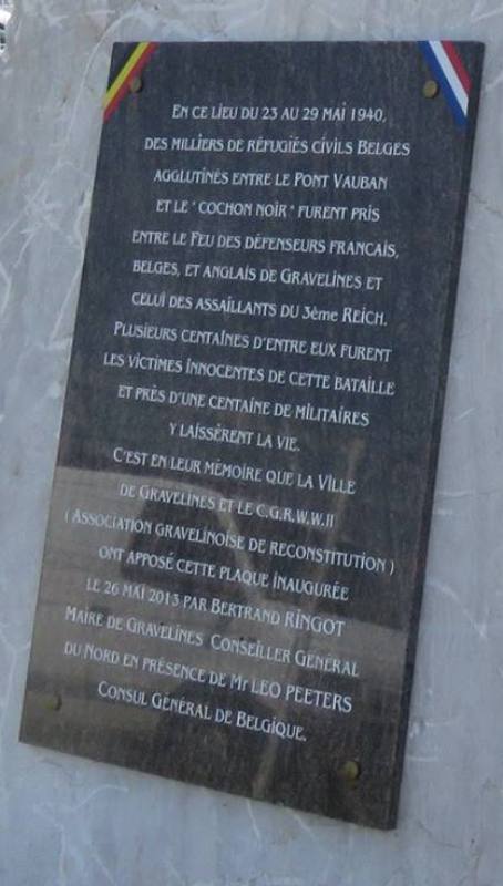 Localisation - Ligging: Route de Calais (route Départementale D11A), à côté d'un pont et d'un garage Citroën. Route de Calais (D11A), naast een brug en een garage Citroën. Coordonnées GPS - GPS-coördinaten: +50°59'09.4", +2°06'58.0" Inscriptions - Opschriften "EN CE LIEU DU 23 AU 29 MAI 1940, DES MILLIERS DE RÉFUGIÉS CIVILS BELGES AGGLUTINÉS ENTRE LE PONT VAUBAN ET LE "COCHON NOIR" FURENT PRIS ENTRE LE FEU DES DÉFENSEURS FRANÇAIS, BELGES, ET ANGLAIS DE GRAVELINES ET CELUI DES ASSAILLANTS DU 3ÈME REICH. PLUSIEURS CENTAINES D'ENTRE EUX FURENT LES VICTIMES INNOCENTES DE CETTE BATAILLE ET PRÈS D'UNE CENTAINE DE MILITAIRES Y LAISSÈRENT LA VIE. C'EST EN LEUR MÉMOIRE QUE LA VILLE DE GRAVELINES ET LE C.G.R.W.W.II (ASSOCIATION GRAVELINOISE DE RECONSTITUTION) ONT APPOSÉ CETTE PLAQUE INAUGURÉE LE 26 MAI 2013 PAR BERNARD RINGOT MAIRE DE GRAVELINES CONSEILLER GÉNÉRAL DU NORD EN PRÉSENCE DE Mr LEO PEETERS CONSUL GÉNÉRAL DE BELGIQUE." Inauguration - Onthulling: 26 mai/mei 2013. Contexte historique - Historisch achtergrond La Voix du Nord.fr: Article 1 du 22 mai 2013, article 2 du 23 mai 2013, article 3 du 30 mai 2013. Site de la Maison du Souvenir de Oupeye: Source - Bron [127]. Vidéo - Video Ce monument ne comporte pas de noms. Op het monument staan geen namen. |
