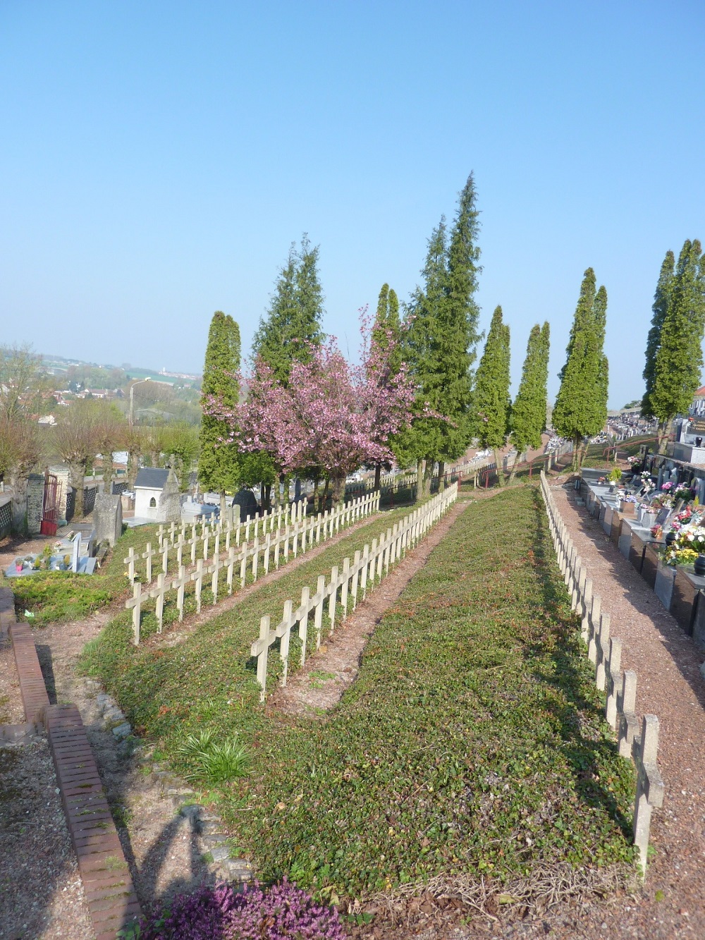 Localisation - Ligging: Cimetière communal, carré militaire français, chemin du Souvenir Français. Gemeentelijke begraafplaats, Frans militair ereperk, chemin du Souvenir Français. Coordonnées GPS - GPS-coördinaten: +50°27'09.76", +2°32'21.98" Description - Beschrijving Deux Belges reposent dans ce cimetière. Twee Belgen rusten op deze begraafplaats Voir les noms des Belges inhumés dans ce cimetière. Zie namen van de Belgen begraven op deze begraafplaats |
