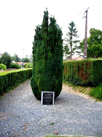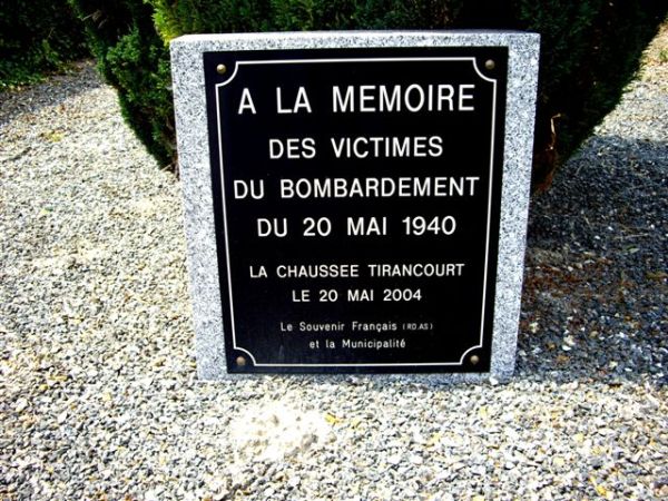 Localisation - Ligging: Rue Henri DE FRANCQUEVILLE. Coordonnées GPS - GPS-coördinaten: +49°57'09.00", +2°9'17.00" Inscriptions - Opschriften "À LA MÉMOIRE DES VICTIMES DU BOMBARDEMENT DU 20 MAI 1940 LA CHAUSSÉE TIRANCOURT LE 20 MAI 2004 LE SOUVENIR FRANÇAIS (RO AS) ET LA MUNICIPALITÉ" Description - Beschrijving Cette plaque commémorative ne comporte pas de noms; cependant, deux noms de victimes civiles belges de ce bombardement ont pu être trouvés sur le site de André SEHET. Er staan geen namen op deze gedenkplaat; toch was het mogelijk om de namen van twee Belgische burgerlijke slachtoffers te vinden op de site van Andre SEHET. Voir les noms des victimes civiles belges - Zie namen van de Belgische burgerlijke slachtoffers |