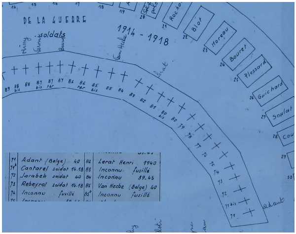 Localisation - Ligging: Carré militaire français du cimetière du Clos du Roy - Frans militair ereperk op de begraafplaats "Clos du Roy". Coordonnées GPS: +47° 13' 45.35", +2° 4' 39.85" Description - Beschrijving: Deux Belges reposent dans ce cimetière. Twee Belgen rusten op deze begraafplaats. Voir les noms des deux Belges inhumés dans ce cimetière - Zie namen van de twee Belgen begraven op deze begraafplaats |