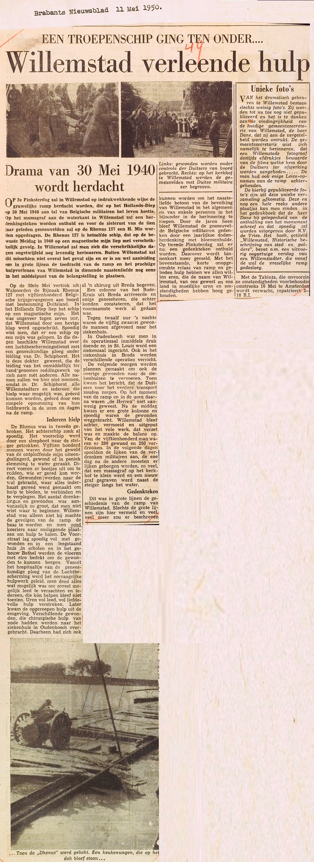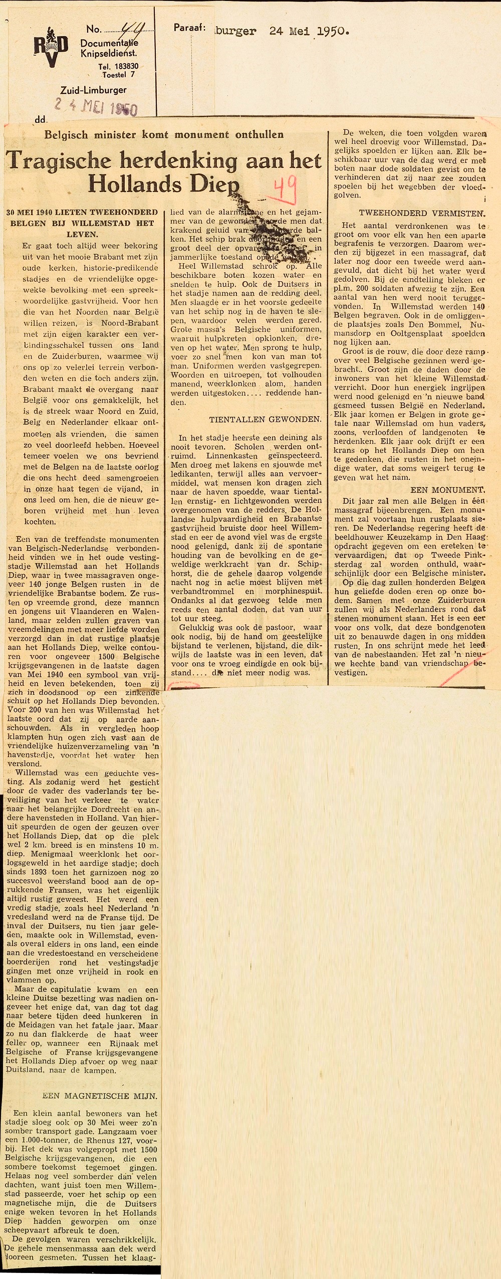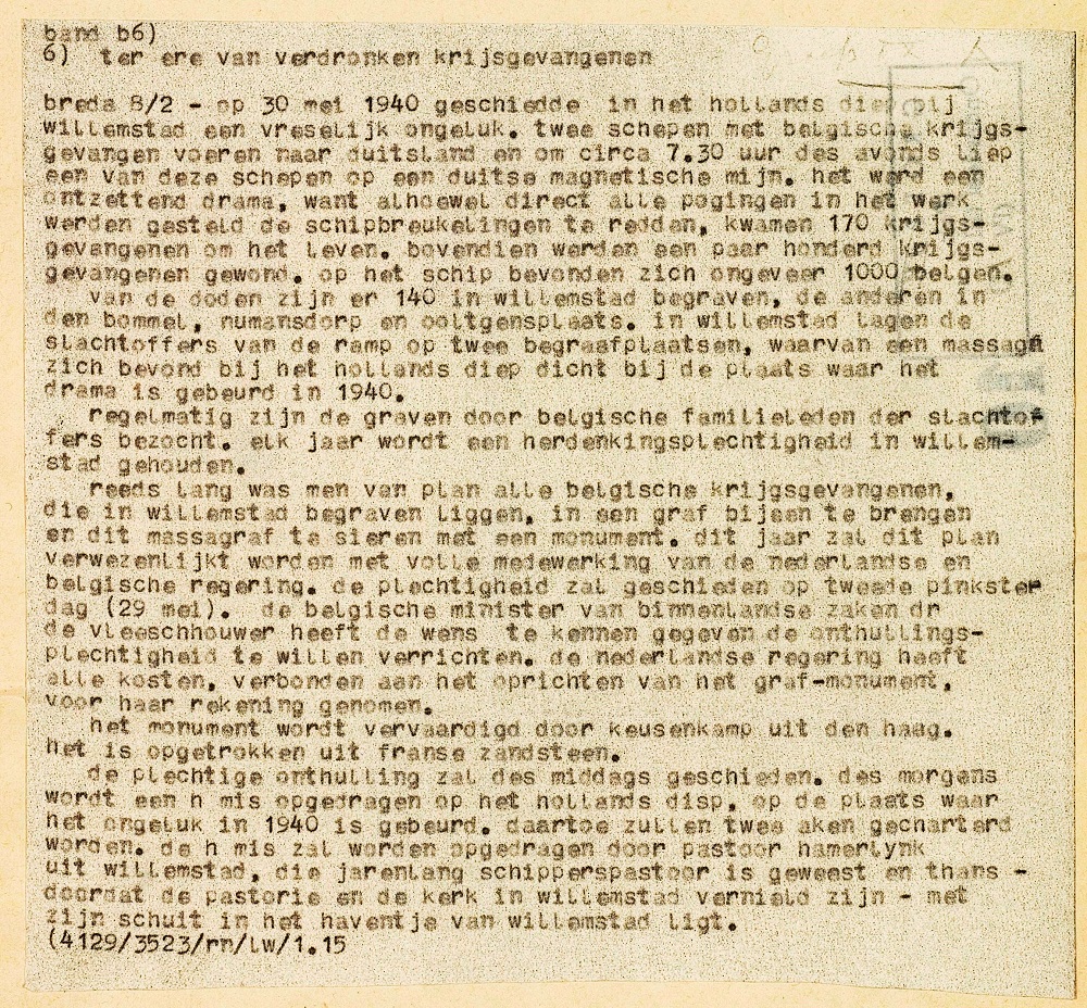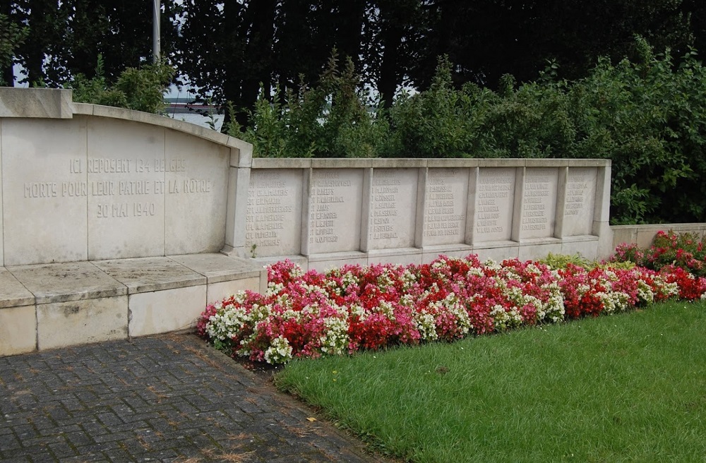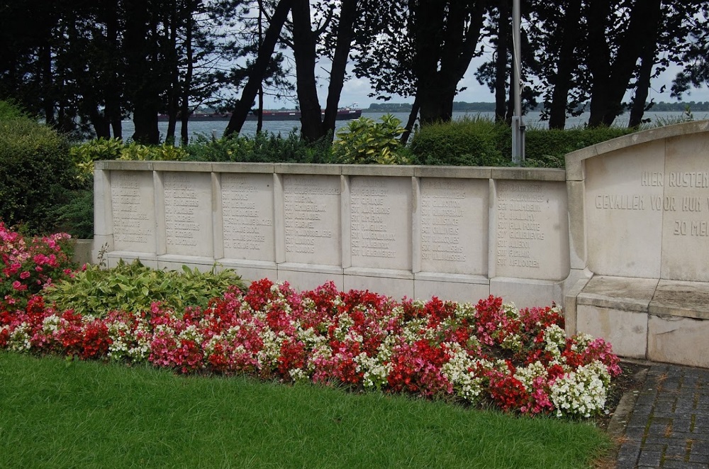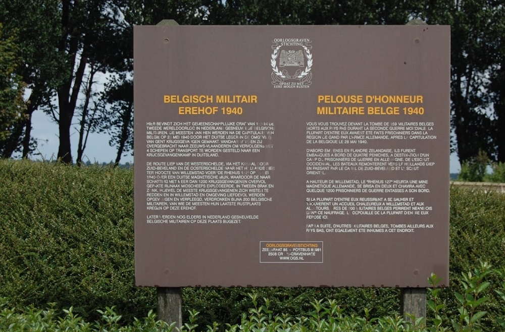 Localisation - Ligging: Park Havenhoofd. Coordonnées GPS - GPS-coördinaten: +51°41'45.24", +4° 26' 28.91" Inscriptions sur le monument - Opschriften op het monument À gauche sous la croix - Links onder het kruis "HIER RUSTEN 134 BELGEN GEVALLEN VOOR HUN VADERLAND EN HET ONZE 30 MEI 1940" À droite sous la croix - Rechts onder het kruis "ICI REPOSENT 134 BELGES MORTS POUR LEUR PATRIE ET LA NÔTRE 30 MAI 1940" Plaquette à l'entrée du cimetière - Plaquette aan de ingang van de begraafplaats "BELGISCH MILITAIR EREHOF 1940 HIER BEVINDT ZICH HET GEMEENSCHAPPELIJK GRAF VAN 159 IN DE TWEEDE WERELDOORLOG IN NEDERLAND GESNEUVELDE BELGISCHE MILITAIREN. DE MEESTE VAN HEN WERDEN NA DE CAPITULATIE VAN BELGIE OP 28 MEI 1940 DOOR HET DUITSE LEGER IN DE OMGEVING VAN GENT KRIJGSGEVANGEN GEMAAKT. VANDAAR WERDEN ZIJ OVERGEBRACHT NAAR ZEEUWS-VLAANDEREN OM VERVOLGENS MET 4 SCHEPEN OP TRANSPORT TE WORDEN GESTELD NAAR EEN KRIJGSGEVANGENKAMP IN DUITSLAND. DE ROUTE LIEP VAN DE WESTER- SCHELDE VIA HET KANAAL DOOR ZUID - BEVELAND EN DE OOSTERSCHELDE NAAR HET HOLLANDS DIEP. TER HOOGTE VAN WILLEMSTAD VOER DE "RHENUS 127" OP 30 MEI 1940 OVER EEN DUITSE MAGNETISCHE MIJN, WAARDOOR DE NAAR SCHATTING MET MEER DAN 1200 KRIJGSGEVANGENEN OVERVOL GEPAKTE RIJNAAK MIDSCHEEPS EXPLODEERDE, IN TWEEEN BRAK EN ZONK. HOEWEL DE MEESTE KRIJGSGEVANGENEN ZICH WISTEN TE REDDEN EN IN WILLEMSTAD EN OMGEVING LIEFDEVOL WERDEN OPGEVANGEN EN VERPLEEGD, VERDRONKEN BIJNA 200 BELGISCHE MILITAIREN VAN WIE DE MEESTEN HUN LAATSTE RUSTPLAATS KREGEN OP DEZE EREHOF. LATER WERDEN NOG ELDERS IN NEDERLAND GESNEUVELDE BELGISCHE MILITAIREN OP DEZE PLAATS BIJGEZET. PELOUSE D'HONNEUR MILITAIRE BELGE 1940 VOUS VOUS TROUVEZ DEVANT LA TOMBE DE 159 MILITAIRES BELGES MORTS AUX PAYS-BAS PENDANT LA SECONDE GUERRE MONDIALE. LA PLUPART D'ENTRE EUX AVAIENT ÉTÉ FAITS PRISONNIERS DANS LA RÉGION DE GAND PAR L'ARMÉE ALLEMANDE APRÈS LA CAPITULATION DE LA BELGIQUE LE 28 MAI 1940. D'ABORD EMMENÉS EN FLANDRE ZÉLANDAISE, ILS FURENT EMBARQUÉS À BORD DE QUATRE PÉNICHES À DESTINATION D'UN CAMP DE PRISONNIERS DE GUERRE EN ALLEMAGNE. DE L'ESCAUT OCCIDENTAL, LES BATEAUX REMONTÈRENT VERS LE HOLLANDS DIEP EN PASSANT PAR LE CANAL DE ZUID - BEVELAND ET L'ESCAUT ORIENTAL. À HAUTEUR DE WILLEMSTAD LE "RHENUS 127" HEURTA UNE MINE MAGNÉTIQUE ALLEMANDE, SE BRISA EN DEUX ET CHAVIRA AVEC QUELQUE 1200 PRISONNIERS DE GUERRE ENTASSÉS À SON BORD. SI LA PLUPART D'ENTRE EUX RÉUSSIRENT À SE SAUVER ET TROUVÈRENT UN ACCUEIL CHALEUREUX À WILLEMSTAD ET AUX ALENTOURS, PRÈS DE 200 MILITAIRES BELGES PÉRIRENT NÉANMOINS DANS CE NAUFRAGE. LA DÉPOUILLE DE LA PLUPART D'ENTRE EUX REPOSE ICI. PAR LA SUITE, D'AUTRES MILITAIRES BELGES TOMBÉS AILLEURS AUX PAYS-BAS ONT ÉGALEMENT ÉTÉ INHUMÉS À CET ENDROIT" Description - Omschrijving De Belgische erebegraafplaats in Willemstad (gemeente Moerdijk) herbergt de graven van een 127 Belgische militairen. Op het ereveld is een abstracte gedenksteen van beton geplaatst. De gedenksteen is 1 meter hoog, 3 meter breed en 3 meter diep. Op de gedenksteen zijn de namen van de 127 gesneuvelde militairen aangebracht. In 1963 zijn twee gedenkstenen aan het monument toegevoegd (Belgische militairen, elders in Nederland gesneuveld, maar later op deze plaats bijgezet) (Bron: Nationaal Comité 4 en 5 mei). Le cimetière belge de Willemstad (commune de Moerdijk) accueille les tombes de 127 militaires belges. On y trouve également un monument commémoratif abstrait en béton. Ce monument mesure 1 mètre de haut, 3 mètres de large et 3 mètres de profondeur. Sur ce monument sont gravés les noms des 127 militaires décédés. En 1963, deux plaques commémoratives ont été ajoutées au pied du monument (Militaires belges, tombés ailleurs aux Pays-Bas, mais inhumés à cet endroit par la suite) (Source: Nationaal Comité 4 en 5 mei). Inauguration - Onthulling: 29 mai 1950 - 29 mei 1950. Célébration annuelle du souvenir - Jaarlijkse herdenking: Lundi de Pentecôte - Tweede Pinksterdag Nombreuses photos de ces cérémonies (Frans GORISSEN) - Vele foto's van deze plechtigheden (Frans GORISSEN) Remarque - Opmerking D'après les autorités allemandes, le nombre officiel de victimes de ce naufrage s'élève à 167, mais à en croire les survivants et les services de secours, ce nombre serait beaucoup plus élevé (Source: BN - De Stem). Het officiële Duitse dodental van de scheepsramp was 167, maar volgens overlevenden en reddingswerkers moeten het er veel meer zijn geweest (Bron: BN - De Stem). Plus d'informations concernant la tragédie du Rhenus 127 - Meer informatie over de ramp met de Rhenus 127 Heemkundekring "de Willemstad" (Description de la tragédie, en néerlandais - Beschrijving van de ramp, in het Nederlands) Oorlogsmusea (Description de la tragédie, en néerlandais - Beschrijving van de ramp, in het Nederlands) Drukkerij Repro en Weekblad de Ster (Nombreuses photos, en néerlandais - Veel foto's, in het Nederlands) Fraternelle des Chasseurs ardennais (Description de la tragédie et témoignage d'un survivant, en français - Beschrijving van de ramp en getuigenis van een overlevende, in het Frans) Voir les noms mentionnés sur ce monument - Zie namen gebeiteld op het monument (Cette liste contient également les noms de soldats morts lors du naufrage du Rhenus, mais dont les noms ne figurent pas sur le monument - Deze lijst bevat ook namen van soldaten die bij de scheepsramp van de Rhenus omgekomen zijn maar die niet op het monument voorkomen) |