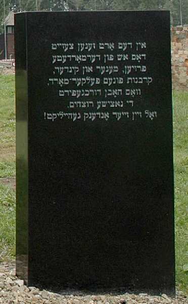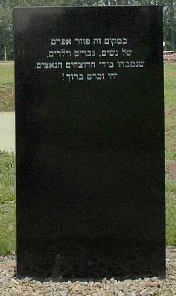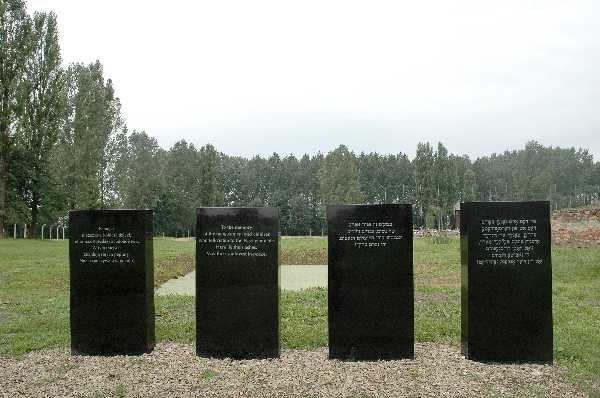 Localisation - Situering: Camp d'extermination de Auschwitz-Birkenau - Vernietigingskamp Auschwitz-Birkenau. Inscriptions - Opschriften Stèle 1 (Polonais) - Gedenksteen 1 (Pools) "PAMIĘCI MĘŻCZYZN, KOBIET I DZIECI, OFIAR NAZISTOWSKIEGO LUDOBÓJSTWA. W TYM MIEJSCU ZNAJDUJĄ SIĘ ICH POPIOLY. NIECH SPOCZYWAJĄ W POKOJU." Stèle 2 (Anglais)- Gedenksteen 2 (Engels) "TO THE MEMORY OF THE MEN, WOMEN, AND CHILDREN WHO FELL VICTIM TO THE NAZI GENOCIDE. HERE LIE THEIR ASHES. MAY THEIR SOULS REST IN PEACE." Stèle 3 (Hébreu) - Gedenksteen 3 (Hebreeuws) במקום זה פוזרו אפרם ,של נשים, גברים וילדים .שנטבחו בידי הרוצחים הנצים ! יהי זכרם ברוך Traduction anglaise - Vertaling in het Engels "In this place the ashes were scattered of the women, men, and children slaughtered by the murderous nazis Blessed be their memory !" (Transcription et traduction en anglais par M. Arye GOLDMAN, York, Pennsylvanie, USA) Stèle 4 (Yiddish) - Gedenksteen 4 (Yiddish) אין דעס ארט זענען צעוייט דאס אש פון דערמאררעטע פרויען , מענער און קינדער, קרבנות פונעם פעלקער-מארד, וואס האבן דורכנעפירט די נאצישע רוצחים. ואל זיין זייער אנדענק געהייליקט Traduction anglaise - Vertaling in het Engels "In this grave site The ashes of the martyred Men, women, and children Korbanot* of the [something with people and death in the root - probably "genocide"] That were carried out [by] The Nazi murderers And for this may their memories be very sanctified" *(Hebrew word meaning the sacrifices, in Jewish tradition, that were brought to the Temple in Jerusalem) Traduction trouvée grâce au site Yahoo!Answers Pour plus d'informations concernant le camp d'Auschwitz-Birkenau, cliquer ici (Wikipedia) Voor meer information over de concentratiekamp Auschwitz-Birkenau, hier klikken (Wikipedia) Ce monument ne comporte pas de noms. Er staan geen namen op het monument. |