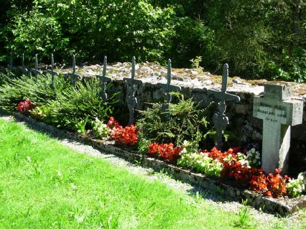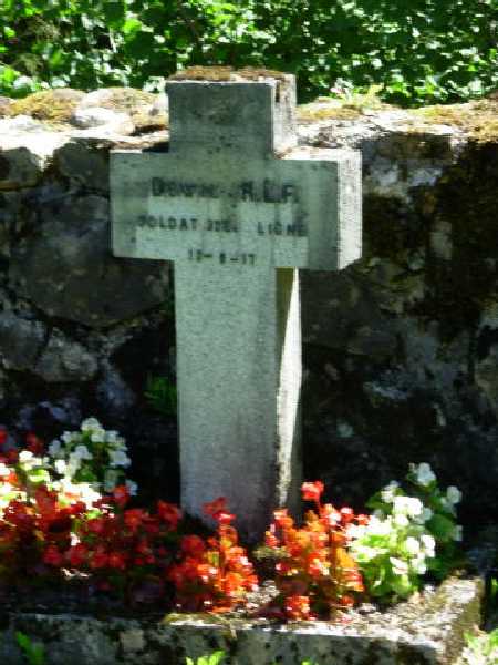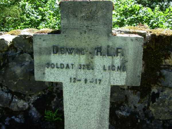 Localisation - Situering: Cimetière communal - Gemeentelijke kerkhof. Inscription - Opschrift "DEWIL R.L.F. SOLDAT 32E. LIGNE 12 - 9 - 1917" Voir les noms mentionnés sur ce monument - Zie namen gebeiteld op het monument |