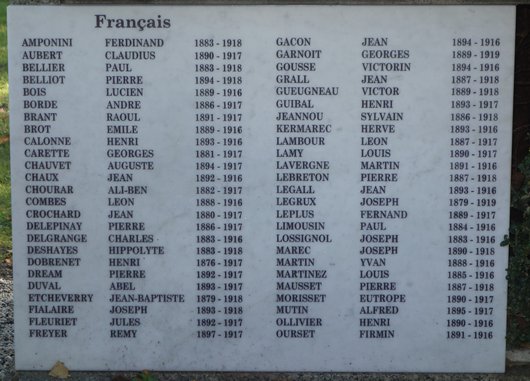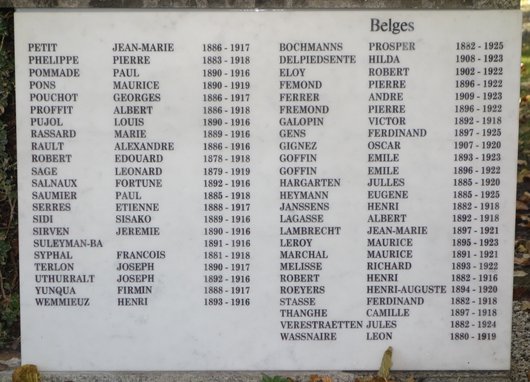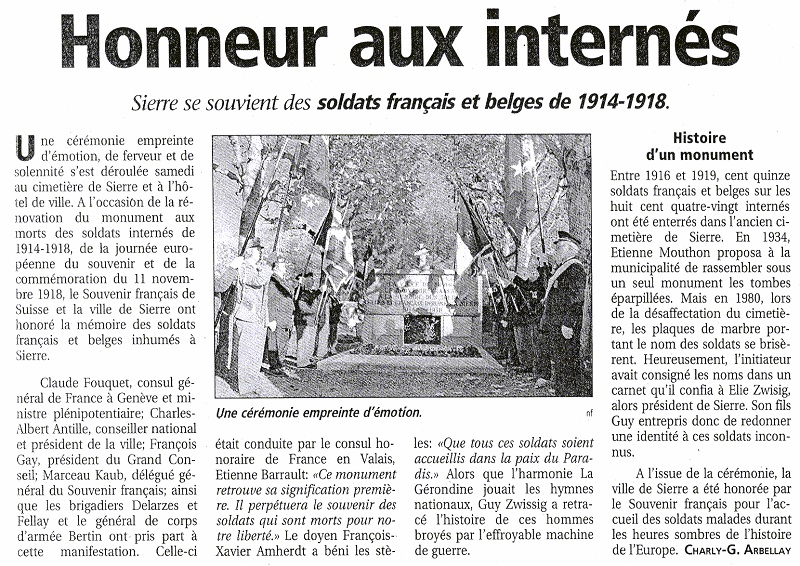 Localisation - Ligging: Nouveau cimetière, Chemin du Petit-Bois. Coordonnées GPS - GPS-coördinaten: +46°17'24.7", +7°32'02.1" Inscriptions - Opschriften "LA FRANCE LA BELGIQUE LA VILLE DE SIERRE LE SOUVENIR FRANCAIS À LA MÉMOIRE DES SOLDATS BELGES ET FRANCAIS INHUMÉS À SIERRE 1914-1918 FRANÇAIS [Septante-deux noms, classés par ordre alphabétique, avec mention des années de naissance et de décès - Tweeenzeventig namen, alfabetisch gerangschikt, met vermelding van geboorte- en overlijdensjaren] BELGES [Vingt-cinq noms, classés par ordre alphabétique, avec mention des années de naissance et de décès - Vijfentwintig namen, alfabetisch gerangschikt, met vermelding van geboorte- en overlijdensjaren]" Plaque du Souvenir français à l'avant-plan - Gedenkplaat Souvenir français aan de voorkant "SOUVENIR FRANCAIS CARRÉ MILITAIRE TOMBES DE SOLDATS MORTS POUR LA FRANCE" Remarque - Opmerking Les plaques avec les noms des victimes belges et françaises ont été ajoutées entre 2006 et 2014. De gedenkplaten met de namen van de Belgische en Franse soldaten werden toegevoegd tussen 2006 en 2014. Carnet de Etienne MOUTON avec la liste des soldats belges inhumés à Sierre en 1914 - 1918 Dagboek van Etienne MOUTON met een lijst van de Belgische soldaten begraven te Sierre in 1914 - 1918 Pages du carnet de Etienne MOUTON, délégué à Sierre du Souvenir Français en Suisse, avec la liste des soldats belges (et d'autres nationalités) inhumés à Sienne - Bladzijden van het dagboekje van Etienne MOUTON, afgevaardigde in Sierre van de Souvenir Français en Suisse, met een lijst van de Belgische soldaten (en van andere nationaliteiten) begraven te Sierre - Couverture - Omslag - 20 avril/april 1916 - 19 octobre/oktober 1916 - Une page est manquante - Een bladzijde ontbreekt - 19 mars/maart 1917 - 26 février/februari 1918 - 26 février/februari 1918 - 13 novembre/november 1918 - 1 janvier/januari 1919 - 10 août /augustus 1923 - 22 août/augustus 1925 - 12 octobre/oktober 1925 Histoire du monument - Geschiedenis van het monument Entre 1916 et 1919, 115 soldats français et belges sur les 880 internés ont été enterrés dans l'ancien cimetière en tombes individuelles. En 1934, sur proposition de M. Etienne MOUTON, délégué à Sierre pour le Souvenir français, les tombes ont été regroupées sous un seul monument. Ce cimetière a été désaffecté en 1980. Ce monument a été rénové en 1998. On trouvera ci-dessous un scan d'un article, tiré du journal "Le Nouvelliste" et daté du 9 novembre 1998, et publié à l'occasion de la rénovation du monument (Source: Guy TERRASSE). Tussen 1916 en 1919 werden 115 Franse en Belgische soldaten op een totaal van 880 geïnterneerde soldaten, begraven op de oude begraafplaats in individuele graven. In 1934 werden, op voorstel van dhr. Etienne MOUTON, afgevaardigde van de Souvenir français te Sierre, de graven onder één monument gegroepeerd. De oude begraafplaats werd gesloten in 1980. Het monument werd gerenoveerd in 1998. Hieronder vindt u een scan van een artikel uit het dagblad "Le Nouvelliste" van 9 november 1998 en gepubliceerd naar aanleiding van de renovatie van het monument (Bron: Guy TERRASSE). Remarque - Opmerking Pour la liste des soldats français mentionnés sur ce monument et les informations complémentaires les concernant, consulter la source [26]. Voor de lijst van de Franse soldaten vermeld op dit gedenkteken en bijkomende informatie over deze slachtoffers, raadpleeg bron [26]. Outre les noms mentionnés sur le monument, Guy TERRASSE a pu reconstituer une liste complémentaire des personnes autrefois enterrées à Sierre à partir des informations contenues dans le carnet de M Etienne MOUTON (voir ci-dessus), délégué à Sierre du Souvenir français. Naast de namen die vermeld worden op het gedenkteken heeft Guy TERRASSE een aanvullende lijst kunnen samenstellen van de personen die destijds in Sierre werden begraven, op basis van de informatie vervat in het dagboek van Etienne MOUTON (zie hierboven) afgevaardigde van de Souvenir français te Sierre. Voir les noms des Belges mentionnés sur le monument et sur la liste des noms reconstituée par Guy TERRASSE - Zie namen van de Belgen vermeld op het monument en op de lijst samengesteld door Guy TERRASSE |