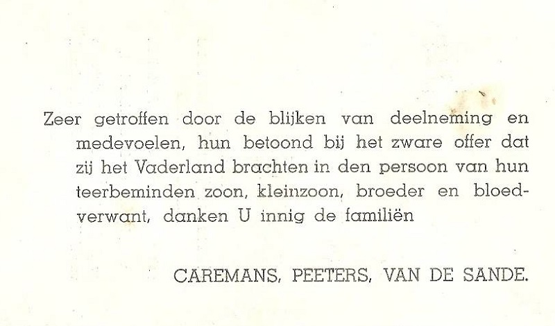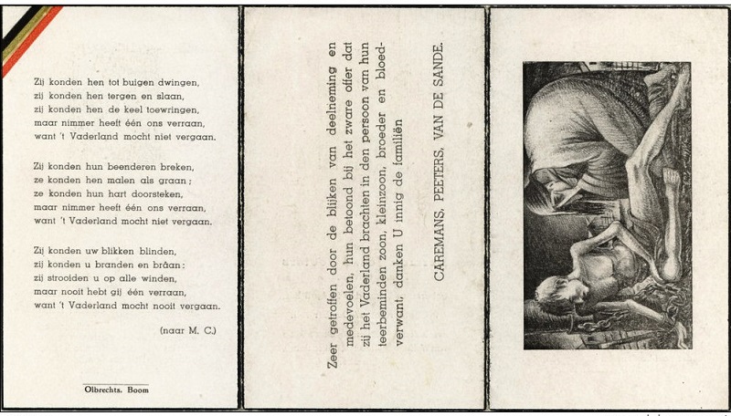 Situering: Privécollectie. Opschriften op het document Voorkant "[Drie namen, met foto's, alfabetisch gerangschikt, met vermelding van verscheidene informatie en overlijdensomstandigheden]" Achterkant Zie scans onderaan. Zie namen vermeld op het document |