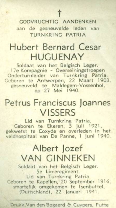 Situering van het document: Private collectie. Opschriften op het document "[Drie namen, chronologisch gerangschikt naar overlijdensdatum, met foto's]" "GODVRUCHTIG AANDENKEN AAN DE GESNEUVELDE LEDEN VAN TURNKRING PATRIA [Drie namen, chronologisch gerangschikt naar overlijdensdatum, met vermelding van geboorteplaats en -datum, overlijdensomstandigheden en overlijdensplaats en -datum]" Zie namen vermeld op het document |