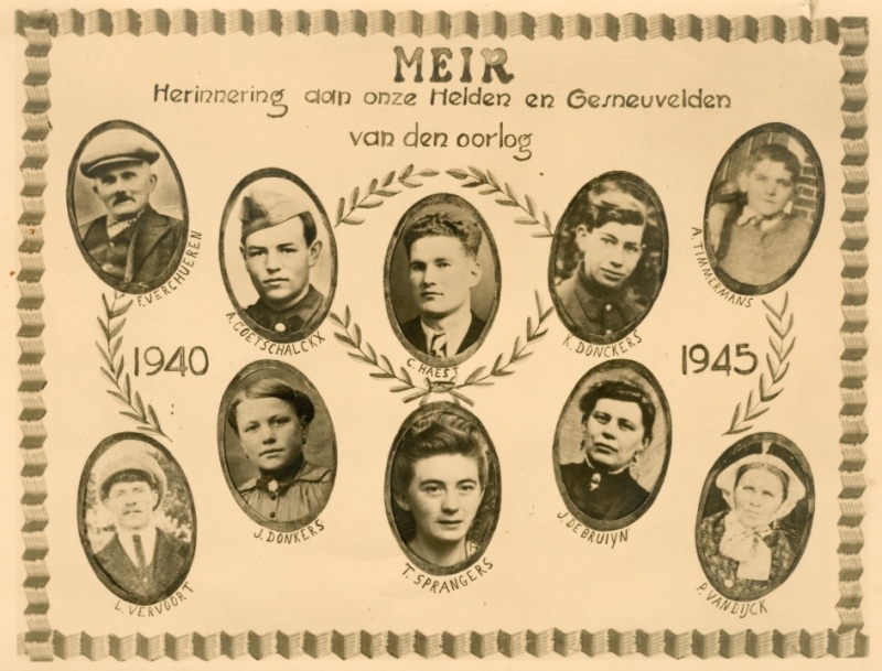 Situering: Collectie Erfgoedbank Hoogstraten (samenwerking tussen het Stedelijk Museum Hoogstraten, het Stadsarchief van Hoogstraten en vzw Erfgoed Hoogstraten). Opschriften op het document "MEIR HERINNERING AAN ONZE HELDEN EN GESNEUVELDEN VAN DEN OORLOG 1940 - 1945 [Tien namen met foto's]" Zie namen vermeld op het document |