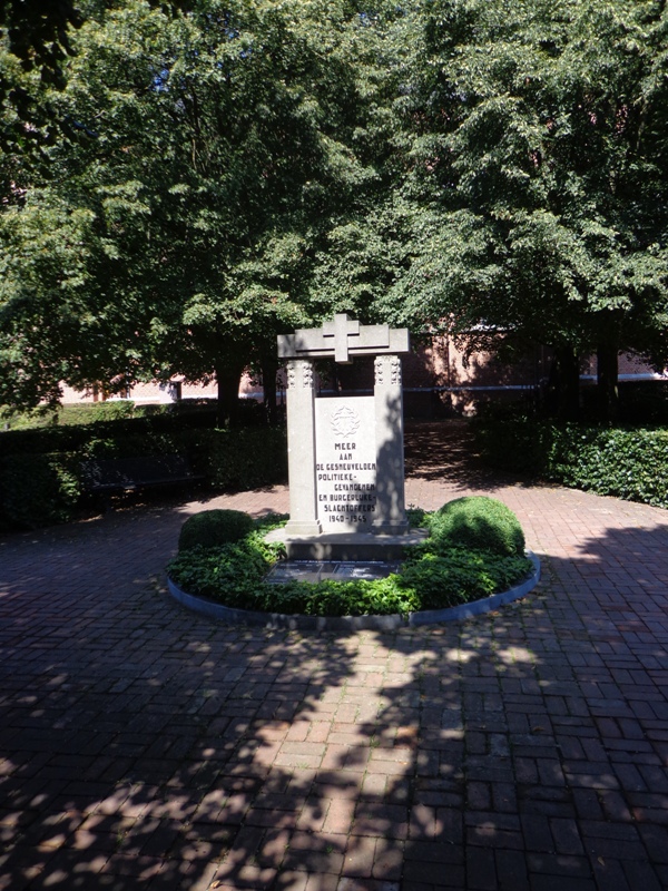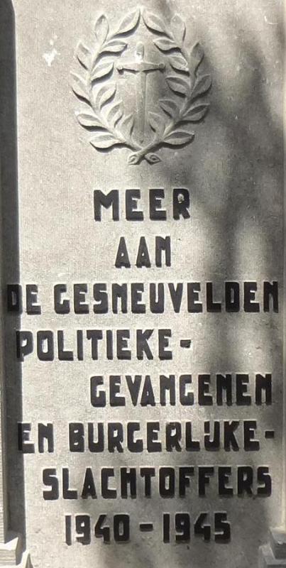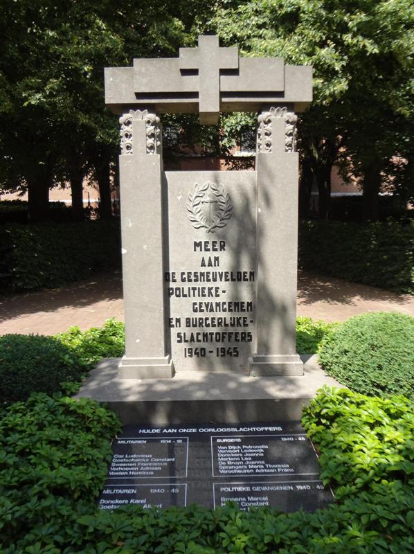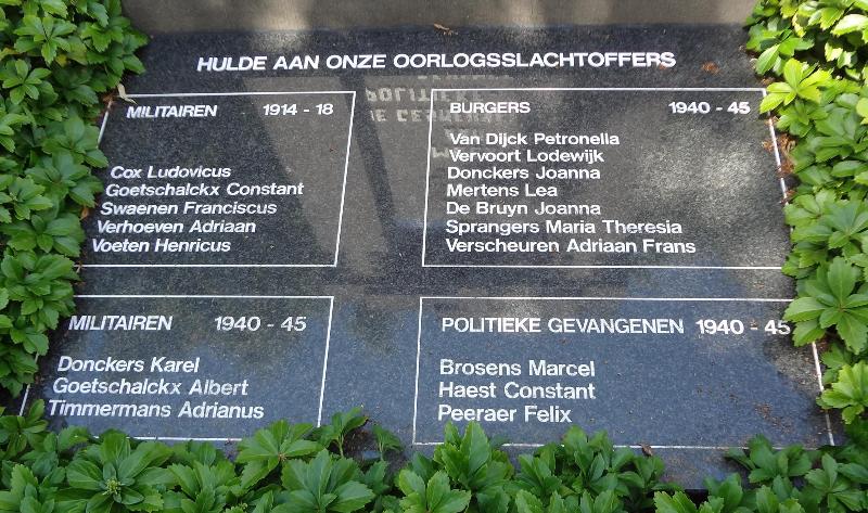 Situering: Nabij kerk (Onze-Lieve-Vrouw Bezoeking). GPS-coördinaten: +51°26'33.5", +4°44'12.7" Opschriften Voorkant "MEER AAN DE GESNEUVELDEN 1914 - 1918" Achterzijde "MEER AAN DE GESNEUVELDEN POLITIEKE- GEVANGENEN EN BURGERLIJKE- SLACHTOFFERS 1940 - 1945" Gedenkplaat voor het monument "HULDE AAN ONZE OORLOGSSLACHTOFFERS MILITAIREN 1914 - 18 [Vijf namen, alfabetisch gerangschikt] MILITAIREN" 1940 - 45 [Drie namen, alfabetisch gerangschikt] BURGERS 1940 - 45 [Zeven namen, niet alfabetisch gerangschikt] POLITIEKE GEVANGENEN 1940 - 45 [Drie namen, alfabetisch gerangschikt]" Zie namen gebeiteld op het monument |