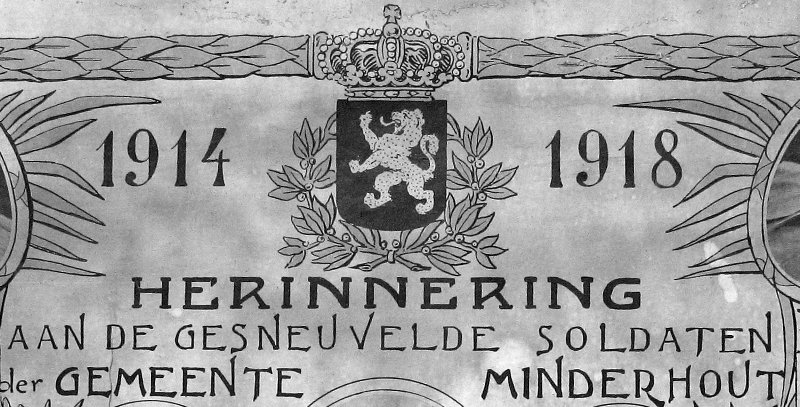 Situering: Collectie Erfgoedbank Hoogstraten (samenwerking tussen het Stedelijk Museum Hoogstraten, het Stadsarchief van Hoogstraten en vzw Erfgoed Hoogstraten). Opschriften op het document "[Medaillon voor Koningin Elisabeth] 1914 - 1914 [Medaillon van Koning Albert] HERINNERING AAN DE GESNEUVELDE SOLDATEN DER GEMEENTE MINDERHOUT [Acht namen, niet alfabetisch gerangschikt, met foto's]" Uitvoering: M. MAUQUOY & Zonen, Antwerpen (gesigneerd) Zie namen vermeld op het aandenken |