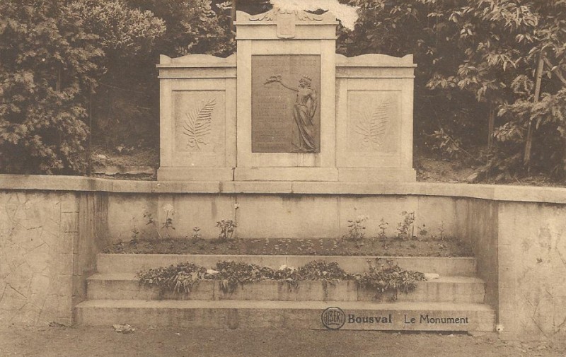 Localisation: Place communale, sur un des flancs de l'église Saint-Barthélémy. Coordonnées GPS: +50°36'59.45", +4°30'31.19" Inscriptions Panneau gauche "1940 - 1945 COMBATTANTS [Trois noms classés par ordre alphabétique] VICTIMES CIVILES [Deux noms classés par ordre alphabétique]" Panneau central "HONNEUR À NOS HÉROS 1914 - 1918 [Neuf noms non classés par ordre alphabétique]" Panneau droit "1940 - 1945 FUSILLÉS [Cinq noms classés par ordre alphabétique] DÉPORTÉ [Un nom]" Voir les noms mentionnés sur le monument |