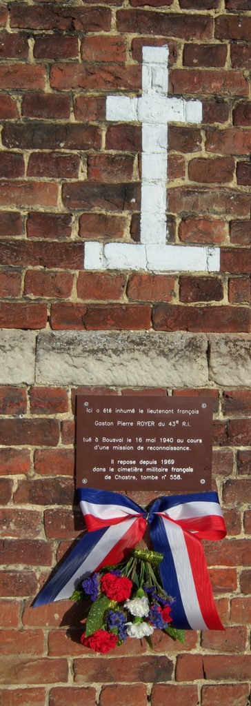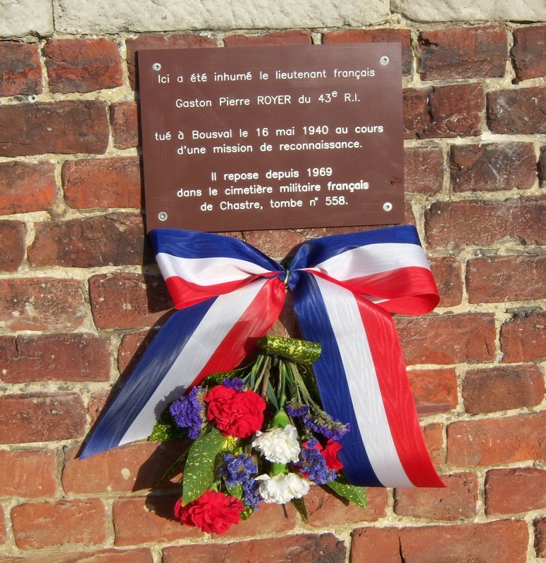 Localisation: Place communale, sur un des murs latéraux de l'église Saint-Barthélémy, juste derrière le monument aux morts. Coordonnées GPS: +50°36'59.45", +4°30'31.19" Inscriptions figurant sur la plaque comémorative (difficilement lisible) Nouvelle plaque inaugurée le 11 novembre 2012 "ICI A ÉTÉ INHUMÉ LE LIEUTENANT FRANÇAIS GASTON PIERRE ROYEZ DU 43E R.I. TUÉ À BOUSVAL LE 16 MAI 1940 AU COURS D'UNE MISSION DE RECONNAISSANCE. IL REPOSE DEPUIS 1969 DANS LE CIMETIÈRE MILITAIRE FRANÇAIS DE CHASTRE, TOMBE N° 558." Plaque originale "ICI A ÉTÉ INHUMÉ LE LIEUTENANT FRANÇAIS GASTON ROYEZ 43ÈME R.I. TUÉ PAR LES ALLEMANDS LE 16 MAI 1940. DEPUIS 1969 REPOSE DANS LE CIMETIÈRE MILITAIRE FRANÇAIS DE CHASTRE (TOMBE N° 558)" Plus d'information concernant cette personne |