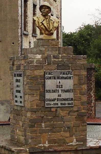 Localisation de ce monument: Place du 7e Tirailleurs Marocain. Inscription figurant sur la plaque "F.N.C. F.N.A.P.G. CORTIL NOIRMONT À / SES / SOLDATS TOMBÉS AU CHAMP D'HONNEUR 1914 - 1918 1940 - 1945" "AUX VICTIMES "AUX VAILLANTS |