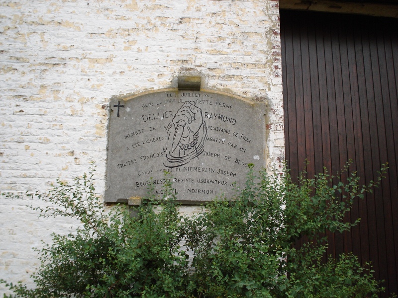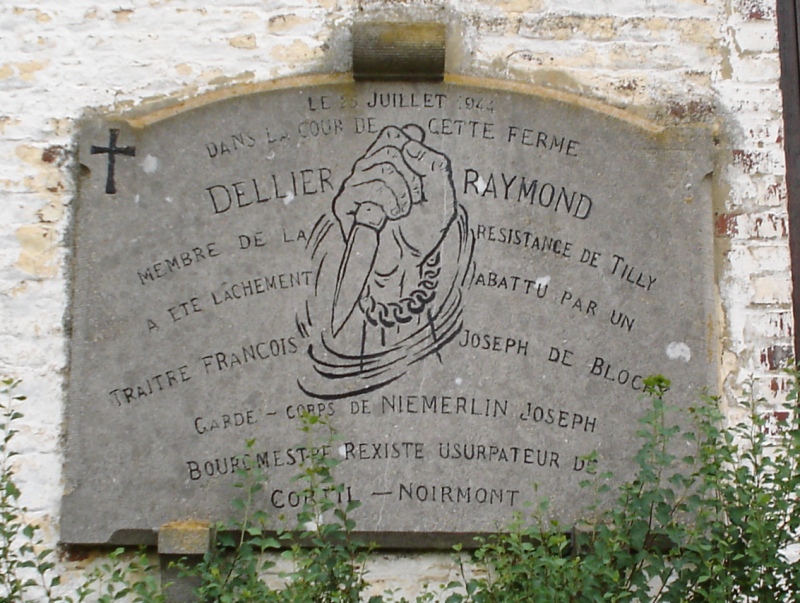 Localisation: Ferme DEWILDE, rue Colonel VENDEUR. Coordonnées GPS: +50°35'17.91", +4°38'20.65" Inscriptions "LE 25 JUILLET 1944 DANS LA COUR DE CETTE FERME DELLIER RAYMOND MEMBRE DE LA RÉSISTANCE DE TILLY A ÉTÉ LÂCHEMENT ABATTU PAR UN TRAÎTRE FRANÇOIS JOSEPH DE BLOCRY GARDE-CORPS DE NIEMERLIN JOSEPH BOURGMESTRE REXISTE USURPATEUR DE CORTIL - NOIRMONT" Remarques L'assassin de Raymond DELLIER est Joseph FRANÇOIS, originaire de Blocry (Ottignies), BW, BE. L'orthographe exacte du nom du bourgmestre de Cortil-Noirmont est NEMERLIN et non NIEMERLIN comme indiqué sur la plaque commémorative (Source [204]). Plus d'informations concernant cette personne |