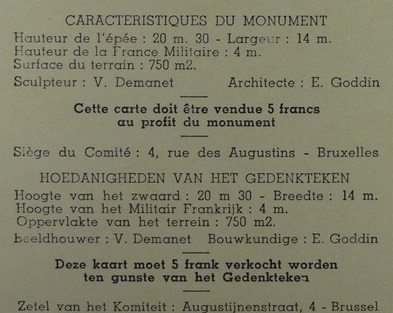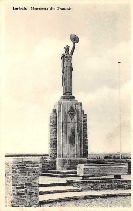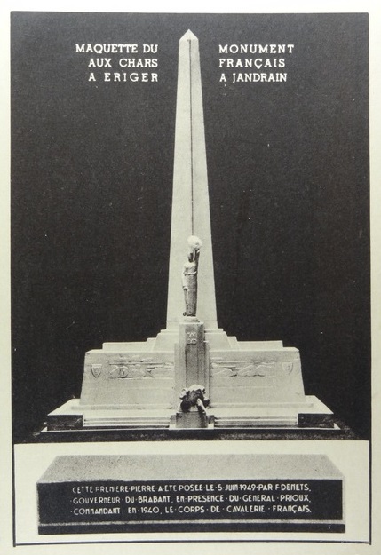 Localisation de ce monument: Avenue Rodolphe Gossia (N 240) Coordonnées GPS : +50°40'32.74", +4°58'19.64" Inscription figurant sur le monument Sur la partie centrale Losange en pierre "CORPS DE CAVALERIE PREMIER ET DERNIER AU FEU" Sur la base "LE 10 MAI 1940 LE CORPS DE CAVALERIE FRANçAIS AFFRONTA L'INVASION SUR LE SOL BELGE ET ENTRAVA L'AVANCE DE L'ENNEMI" Sur le bloc en pierre bleue au pied du monument avec une épée sur la partie supérieure "CETTE PREMIÈRE PIERRE A ÉTÉ POSÉE LE 5 JUIN 1949 PAR F. DEMETS GOUVERNEUR DU BRABANT EN PRÉSENCE DU GÉNÉRAL PRIOUX COMMANDANT EN 1940 LE CORPS DE CAVALERIE FRANçAIS" Sur la pierre posée au sol devant le monument et entourée d'une grille "LES RESCAPÉS DU 1ER CUIR PROMOTEURS DU MONUMENT À LEURS CAMARADES MORTS AU CHAMP D'HONNEUR" Sur les plaques en pierre scellées dans le mur en arc de cercle (de gauche à droite) "13E DRAGONS 29E DRAGONS 8E CUIRASSIERS 1ER DRAGONS 12E ESDR ANTI-CHARS 71E D'ARTILLERIE 101E B BIE 405E R.A.D.C.A. 54E 56E BON DE MITRAILLEURS G.R.C.A. N° 3-5-7 G.R.D.I.N. N° 3-4-7 329E D'ARTILLERIE 13E 35E BON DE CHARS 76E D'ARTILLERIE 10 23 BIE 404E R.A.D.C.A. 11E DRAGONS 13E ESDR ANTI-CHARS 12E CUIRASSIERS 2E CUIRASSIERS 1ER CUIRASSIERS PROMOTEUR DU MONUMENT" Sculpteur - Beeldhouwer: V. DEMANET Architecte - Bouwkundige: E. GODDIN Ce monument ne comporte pas de noms |