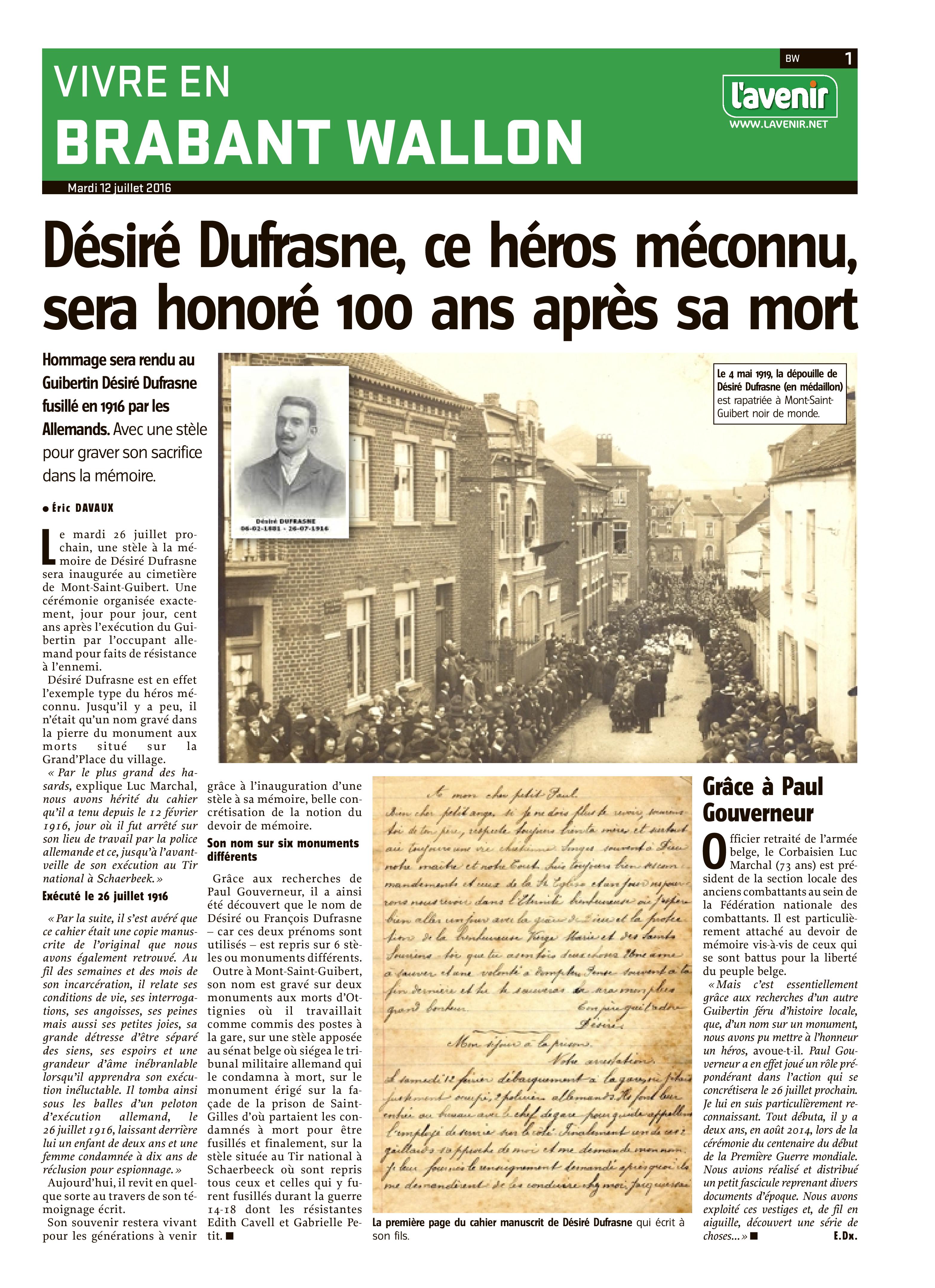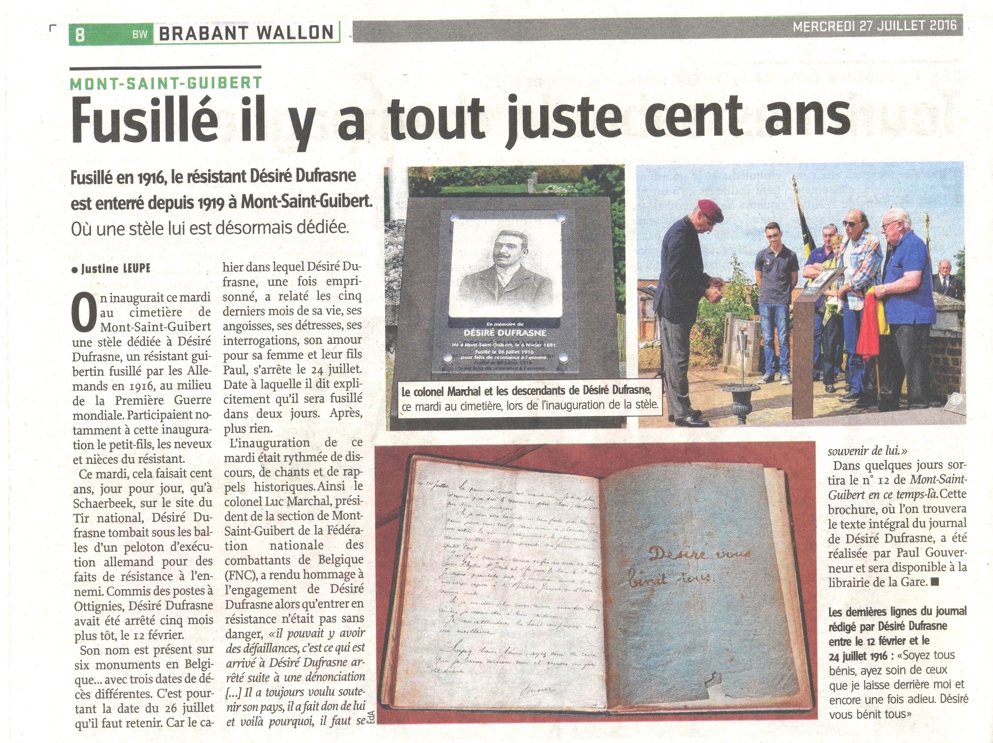Localisation: Cimetière de Mont-Saint-Guibert, à l'intersection de la Rue des Hayeffes et de la Petite Chaussée. Coordonnées GPS : +50°38'10.68", +4°36'15.40" Inscriptions "EN MÉMOIRE DE DÉSIRÉ DUFRASNE NÉ À MONT-SAINT-GUIBERT, LE 6 FÉVRIER 1881. FUSILLÉ LE 26 JUILLET 1916 POUR FAITS DE RÉSISTANCE À L'ENNEMI." Inauguration: 26 juillet 2016 (Source [204]). Plus d'informations concernant cette victime |