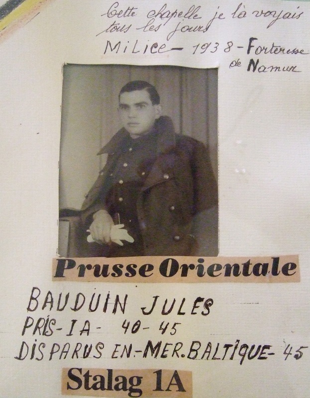 Localisation de ce document: Chapelle, Sainte-Wivine, rue Sainte-Wivine. Coordonnées GPS : +50°40'2.98", +4°44'52.41" Inscription figurant sur le document "CETTE CHAPELLE JE LA VOYAIS TOUS LES JOURS MILICE - 1938 - FORTERESSE DE NAMUR [Photo] PRUSSE ORIENTALE BAUDUIN JULES PRIS-IA - 40-45 DISPARUS EN MER BALTIQUE 45 SATALAG 1A" Plus d'informations concernant cette personne |