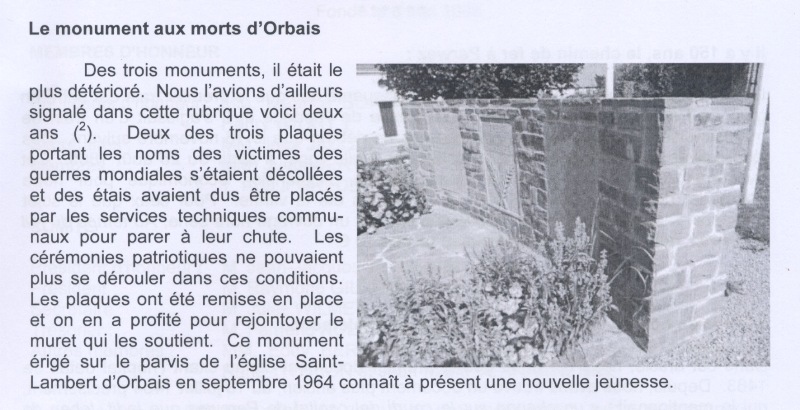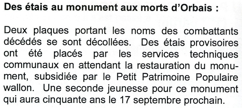 Localisation de ce monument: Rue Trémouroux, sur l'espace herbeux devant l'église Saint-Lambert. Coordonnées GPS: +50°38'14.17", +4°45'49.06" Inscriptions figurant sur le monument Sur le monument Plaque de gauche "1914-1918 MILITAIRES [Cinq noms, non classés par ordre alphabétique] 1940-1945 [Deux noms, non classés par ordre alphabétique]" Plaque centrale "ORBAIS À SES MORTS DES DEUX GUERRES" Plaque de droite "1914-1918 CIVILS [Un nom] 1940-1945 [Trois noms, non classés par ordre alphabétique]" Sur le canon de la Brigade Piron Plaque du haut "BRIGADE PIRON 1944-1945 NORMANDIE CANAL DE WESSEM" Plaque du bas "G.A.P.E.P. GROUPEMENT DES ASSOCIATIONS PATRIOTIQUES DE L'ENTITÉ PERWÉZIENNE GUN MEMORY" Voir les noms mentionnés sur le monument |