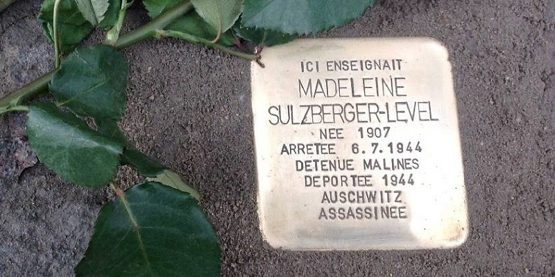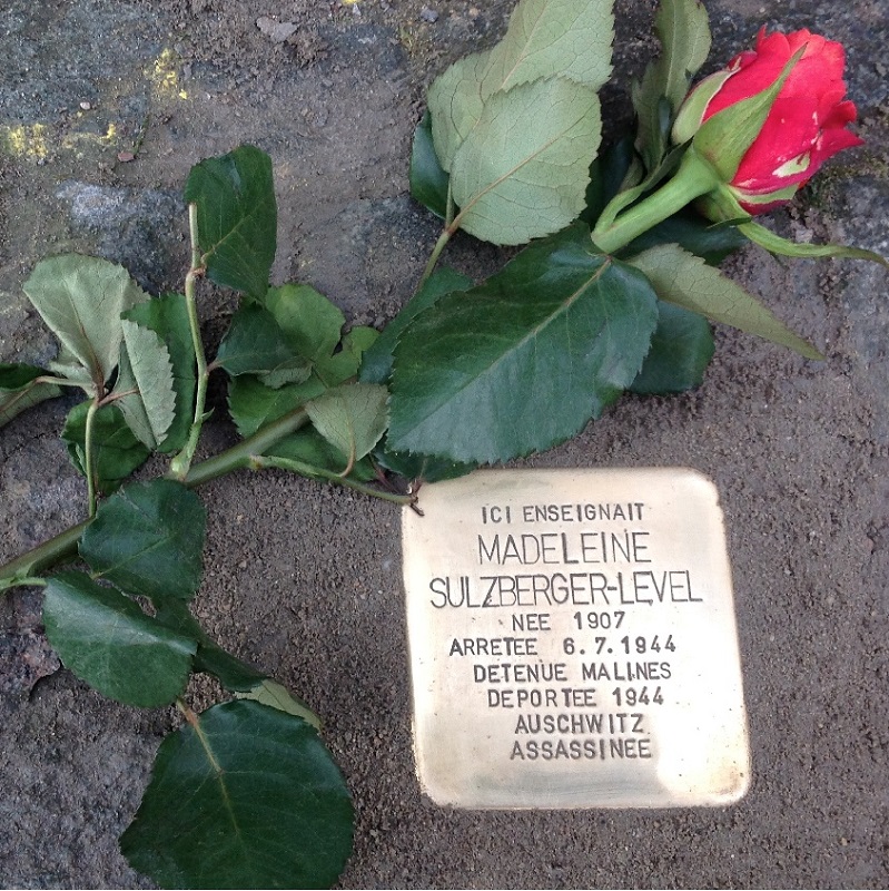 Localisation - Ligging: Devant l’entrée du Lycée Émile JACQMAIN ,135 rue Belliard, dans le Parc Léopold. Coordonnées GPS - GPS-coördinaten: +50°50'21.8", +4°22'43.2" Inscriptions - Opschriften "ICI ENSEIGNAIT MADELEINE SULZBERGER-LEVEL NÉE 1907 ARRÊTÉE 6.7.1944 DÉTENUE MALINES DÉPORTÉE 1944 AUSCHWITZ ASSASSINÉE" Inauguration - Inhuldiging Ce pavé a été inauguré officiellement le 8 mars 2018 à 9h. Que sont les "pavés de mémoire" - Wat zijn de "struikelstenen" Les "pavés de mémoire" sont des carrés de laiton de 10 cm portant l'inscription du nom et de la destinée d'une victime de la Shoah. Ils sont insérés dans les trottoirs, devant la maison où celle-ci a vécu et d'où elle est partie vers les camps de concentration. Ces "pavés de mémoire" ("Stolpersteine" en allemand, littéralement "pierres d'achoppement" en français) sont une création de l'artiste allemand Gunter DEMNIG. De "struikelstenen" zijn 10 cm grote vierkante