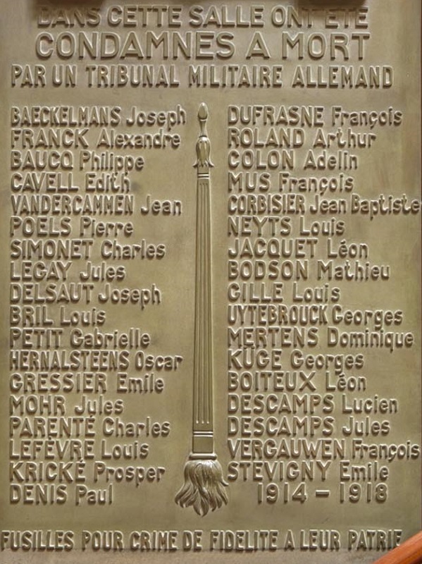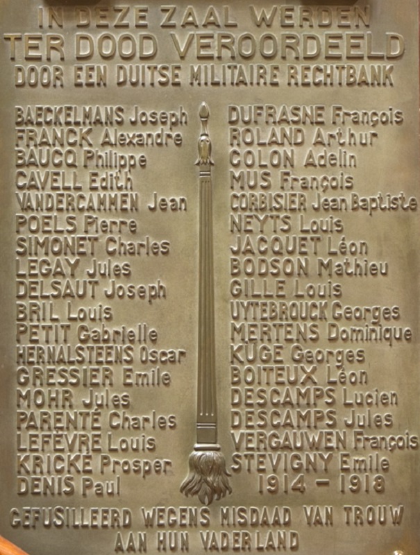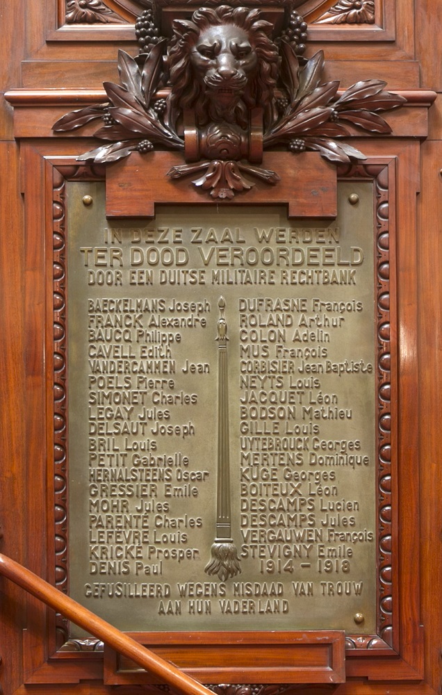 Localisation - Ligging: Palais de la Nation, Hémicycle, rue de la Loi. Paleis der Natie, Halfrond, Wetstraat. Coordonnées GPS - GPS-coördinaten: +50°50'47.02", +4°21'52.19". Inscriptions - Opschriften Plaque 1 - Plaat 1 "DANS CETTE SALLE ONT ÉTÉ CONDAMNÉS À MORT PAR UN TRIBUNAL MILITAIRE ALLEMAND [Trente-cinq noms, non classés par ordre alphabétique - Vijfendertig namen, niet alfabetisch gerangschikt] 1914 - 1918 FUSILLÉS POUR CRIME DE FIDÉLITÉ À LEUR PATRIE" Plaque 1 - Plaat 1 "IN DEZE ZAAL WERDEN TER DOOD VEROORDEELD DOOR EEN DUITSE MILITAIRE RECHTBANK [Trente-cinq noms, non classés par ordre alphabétique - Vijfendertig namen, niet alfabetisch gerangschikt] 1914 - 1918 GEFUSILLEERD WEGENS MISDAAD VAN TROUW AAN HUN VADERLAND" Voir les noms gravés sur les plaques commémoratives - Zie namen gebeiteld op de gedenkplaten |