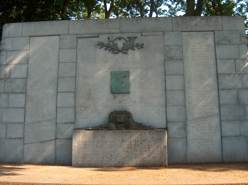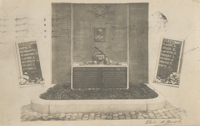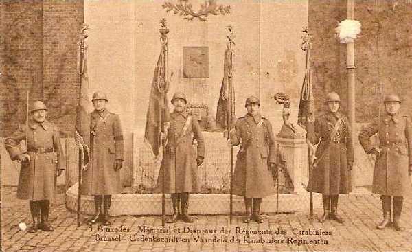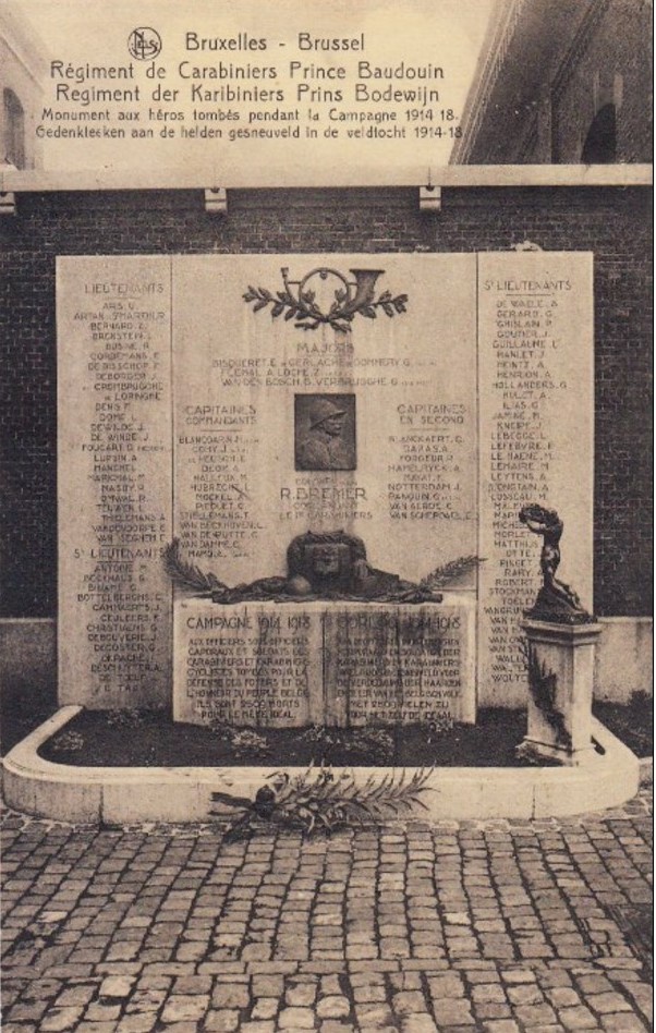 Localisation - Ligging: Avenue Louis BERTRAND, à 100 mètres du carrefour avec le Boulevard Lambermont. Louis BERTRANDLAAN, op 100 meter met het kruispunt van de Lambermontlaan. Coordonnées GPS - GPS-coördinaten: 50° 51' 56.46" N, 4° 23' 01.87" E Inscriptions - Opschriften "CAMPAGNES 1914-1918 / AUX OFFICIERS, SOUS-OFFICIERS / CAPORAUX ET SOLDATS DES / CARABINIERS ET CARABINIERS / CYCLISTES TOMBÉS POUR LA / DÉFENSE DES FOYERS ET DE / L'HONNEUR DU PEUPLE BELGE / ILS SONT 2509 MORTS / POUR LE MEME IDÉAL OORLOG 1914-1918 / AAN DE OFFICIEREN, ONDEROFFICIEREN, / KORPORAALS EN SOLDATEN DER / KARABINIERS EN KARABINIERS / WIELRIJDERS GESNEUVELD VOOR / DE VERDEDIGING DER HAARDEN / EN DE EER VAN HET BELGISCH VOLK / MET 2509 WIELEN / VOOR HET ZELFDE IDEAAL AUX SOUS-OFFICIERS, CAPORAUX ET SOLDATS / MORTS POUR LA PATRIE 1940-1945 AAN DE ONDEROFFICIEREN, KORPORALEN EN / SOLDATEN GESNEUVELD VOOR HET VADERLAND / 1940-1945" A l'arrière du monument, on trouve les inscriptions suivantes : HAELEN-ANVERS-YSER-TERVAETE-STEENSTRAETE-NIEUWDAMME ROULERS-WESTROOSEBEKE-PASSCHENDAELE-RUMBEKE CAMPAGNE DE BELGIQUE - 1940 - VELDTOCHT VAN BELGIE CANAL ALBERT - 1940 - ALBERTKANAAL LES INCOMPARABLES ÉTATS DE SERVICE PENDANT LA GUERRE DES DIFFÉRENTES UNITÉS DE CARABINIERS FORCENT L'ADMIRATION ALBERT HET ONGEEVENAARDE DIENSTBETOON DER VERSCHEIDENE KARABINIERS EENHEDEN GEDURENDE DE OORLOG DWINGT BEWARDERING AF ALBERT" Informations complémentaires - Bijkomende informatie De chaque côté, on peut lire : "1914-1918" et "1940-1945" On trouve aussi trois éléments en cuivre: - l'insigne de l'unité, - le portrait du Colonel BREMER, - la panoplie du combattant en 1914 Langs weerzijde de opschriften : "1914-1918" en "1940-1945" Op het monument drie koperen afbeeldingen : - het kenteken van de eenheid - het portret van Kolonel BREMER - de wapenuitrusting van een strijder in 1914 Voir les noms mentionnés sur ce monument - Zie namen op het monument |