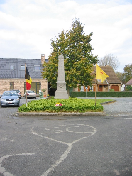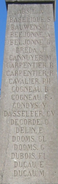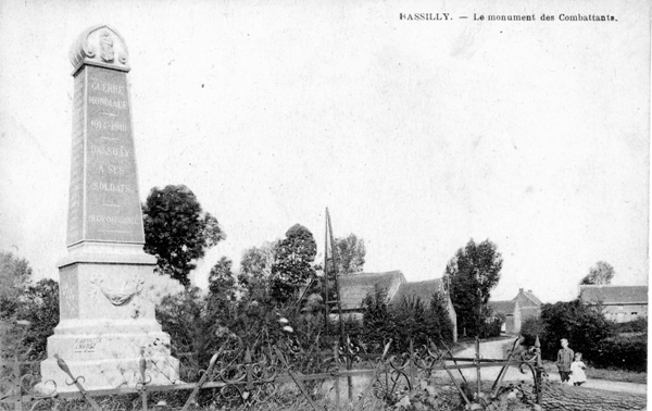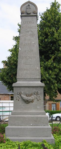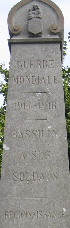 Localisation de ce monument: Dans le triangle formé par la rue du Monument et la rue Cavée. Coordonnées GPS: +50°40’36.22", +3°56’01.49". Inscription figurant sur le monument Face avant "GUERRE / MONDIALE 1914-1918 BASSILLY / À SES / SOLDATS RECONNAISSANCE" Face latérale gauche "[Vingt-et-un noms, classés par ordre alphabétique]" Face latérale droite "[Vingt noms, classés par ordre alphabétique]" Description Monument en pierre du pays, en forme d'obélisque, signé F. VANRECK à Naast. Au sommet de la face avant, l'écusson de Bassilly, sur la partie inférieure, une guirlande de feuilles de chêne avec obus, canons, balles. Sur la partie intermédiaire le texte suivant: "GUERRE MONDIALE 1914-1918 BASSILLY A SES SOLDATS RECONNAISSANCE " Sur les deux faces latérales, les noms des soldats. Situé sur un parterre carré de verdure, entouré d'un grillage composé d'épées entrecroisées, restauré et replacé en décembre 2006 (Source: Léa DE VOS) Inauguration: 11 novembre 1919. Voir les noms gravés sur le monument |