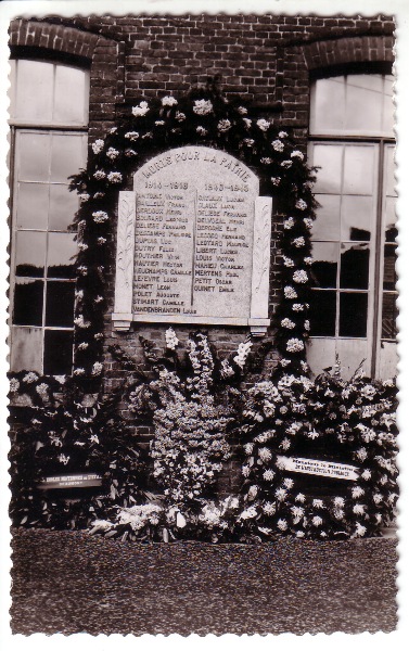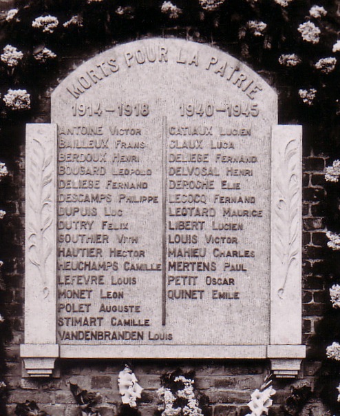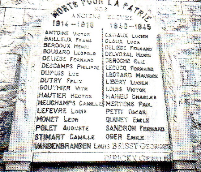 Localisation de ce monument: 3, Rue Germain Michiels. Coordonnées GPS: +50°14'25.37", +4°14'25.37". Inscriptions figurant sur le monument (dans sa version de 1989) "MORTS POUR LA PATRIE NOS ANCIENS ÉLÈVES [Colonne gauche] 1914-1918 [Seize noms, classés par ordre alphabétique] [Colonne droite] 1940-1945 [Dix-sept noms, classés par ordre alphabétique avec trois exceptions]" Historique Cette plaque commémorative a au départ été scellée dans un mur de la cour de l'École moyenne des garçons, rue Charles MOTTOULLE et inaugurée officiellement le 14 juillet 1946. Le mémorial a été transféré à l'Athénée royal le 10 novembre 1989 (Source [102]). Il est à noter que, entre le moment de la première inauguration du monument en 1946 et son transfert vers l'athénée en 1989, quatre noms ont été ajoutés sur le monument. Les photos ci-dessous sont des photos anciennes. Contact a été pris à deux reprises avec l'Athénée de Beaumont afin d'obtenir des photos plus récentes du monument; malheureusement, ces demandes sont à ce jour restées sans réponse. Voir les noms mentionnés sur le monument |