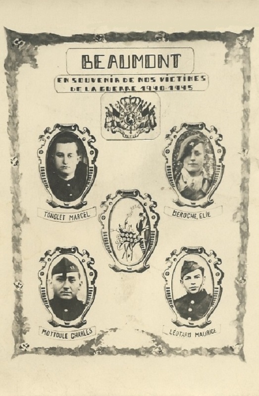 Localisation: Collection privée. Inscriptions figurant sur le document "BEAUMONT EN SOUVENIR DE NOS VICTIMES DE LA GUERRE 1940-1945 [Quatre noms, non classés par ordre alphabétique, avec photos]" Voir les noms mentionnés sur le document |