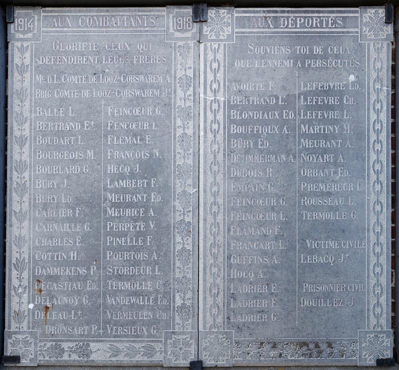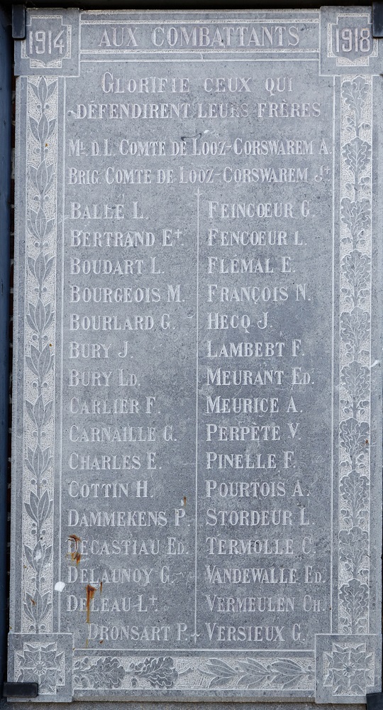 Localisation: Sur la façade de l'église Saint-Pierre, à l'intersection de la Place de Buvrinnes et de la Rue de la Cornette. Coordonnées GPS: +50°23'21.8", +4°12'31.5" Inscriptions Plaque de gauche "1914 AUX COMBATTANTS 1918 GLORIFIE CEUX QUI DÉFENDIRENT LEURS FRÈRES [Trente-quatre noms]" Plaque de droite AUX DÉPORTÉS SOUVIENS-TOI DE CEUX QUE L'ENNEMI A PERSÉCUTÉS [Vingt-sept noms] VICTIME CIVILE [Un nom] PRISONNIER CIVIL [Un nom]" Voir les noms mentionnés sur ce monument |