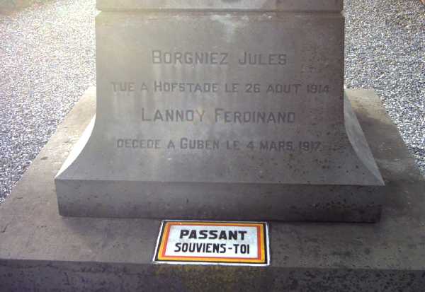Localisation de ce monument: Cimetière de Cour-sur-Heure, Rue Fonds des Bosquets. Coordonnées GPS: 50° 18' 02.10" N, +4° 22' 54.33" E. Inscription figurant sur le monument "1914 - 1918 À NOS MORTS [Deux noms] PASSANT SOUVIENS-TOI" Voir les noms mentionnés sur le monument |