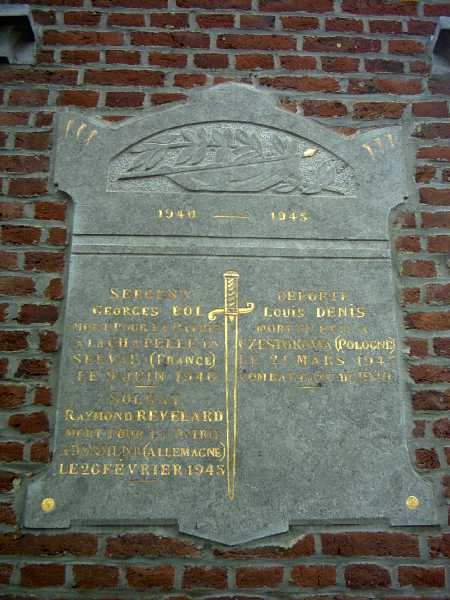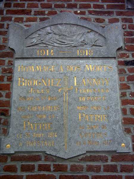 Localisation de ce monument: Sur la façade de l'école située à l'angle des rue Saint-Jean et de la Station. Coordonnées GPS: 50° 18' 00.00" N, 4° 23' 22.00" E. Inscription figurant sur le monument Plaque 1 "1914 - 1918 HOMMAGE À NOS MORTS [Deux noms]" Plaque 2 "1940 - 1945 [Trois noms]" Voir les noms mentionnés sur le monument |