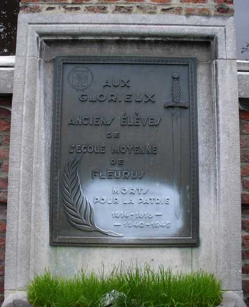 Localisation: Sur le mur de l'Athénée royal, Chaussée de Charleroi. Inscription figurant sur la plaque "AUX GLORIEUX ANCIENS ÉLÈVES DE L'ÉCOLE MOYENNE DE FLEURUS MORTS POUR LA PATRIE 1914 - 1918 1940 - 1945" Ce monument ne comporte pas de noms |