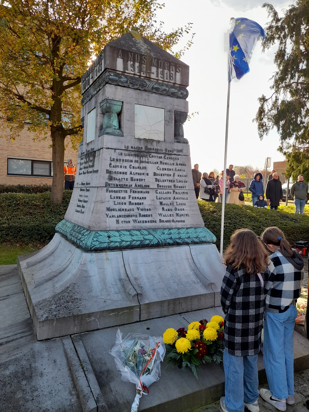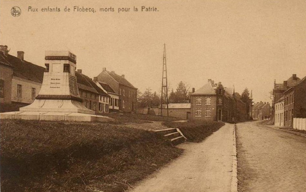 Localisation: Place Paul-Henri JOURET, située à l'intersection des rues de la Gare, Georges JOURET et Père Cambier. Coordonnées GPS: +50°44'14.39", +3°44'41.67" Inscriptions Face avant "À NOS MORTS 1914 - 1918 [Vingt-trois noms]" Face latérale droite "[Six noms]" Face latérale gauche "COMBATTANTS 1940 - 1945 [Dix noms]" Informations complémentaires Erigé sur la place de la Foire (à l'ombre de l'ancien château-fort médiéval) rebaptisée place de la Victoire, un premier monument en bois fut édifié en 1919. Le monument aux morts de la guerre 1914-1918 fut inauguré, le 14 août 1921, par le député-bourgmestre Paul-Henri JOURET en présence des autorités communales et des enfants des écoles. Inauguration: 14 août 1921. Remarque En 2022, le nom d'une victime militaire de 1914-1918, à savoir Alphonse DELIGNE, a été ajouté sur le monument aux morts après démarches introduites par sa famille auprès de la commune de Flobecq. Cet ajout a été commémoré lors des célébrations du 11 novembre 2022. Suggestion de lecture : Petit Guide du parcours mémoriel de la guerre 1914-1918 dans les rues de Flobecq. Voir les noms mentionnés sur le monument |