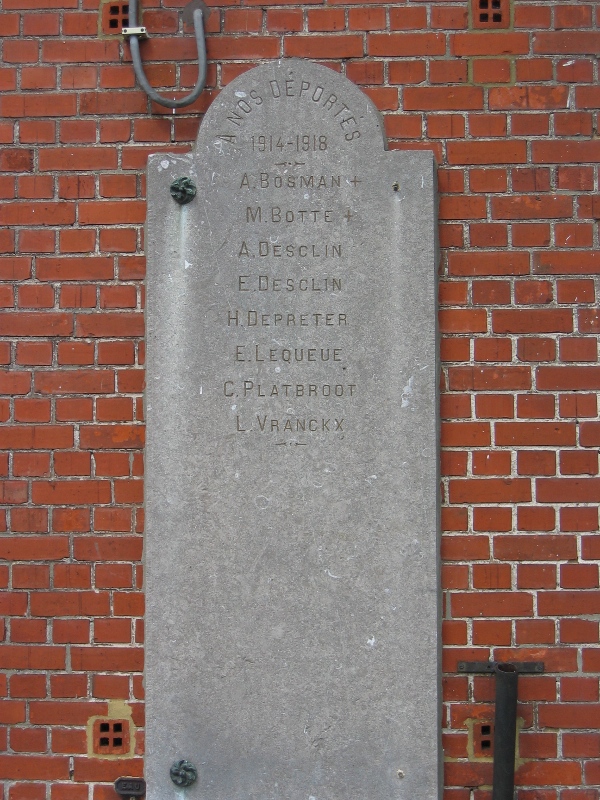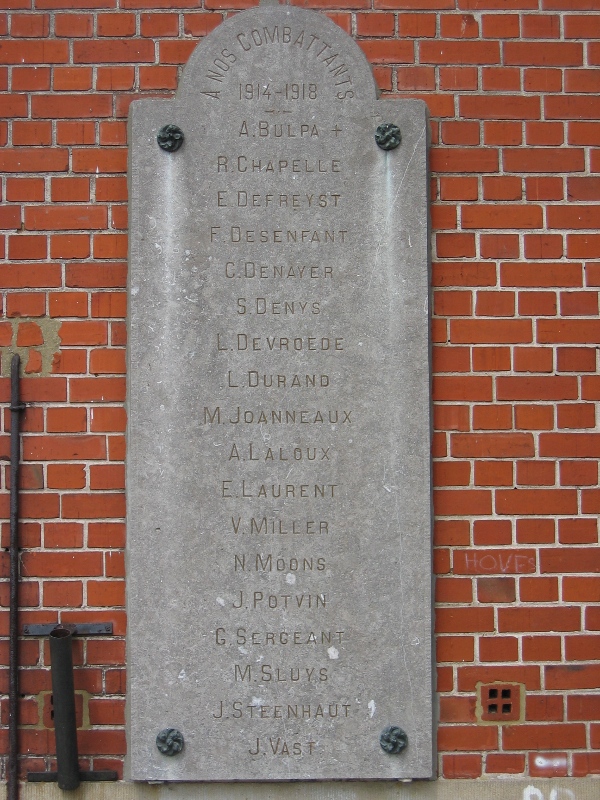 Localisation de ce monument: Sur la façade de l'ancienne Maison Communale, place de Hoves. Coordonnées GPS: +50°40'16.28", +4°02'11.67". Inscriptions figurant sur les stèles Stèle gauche "À NOS COMBATTANTS 1914-1918 [Dix-huit noms, classés par ordre alphabétique; à côté du premier nom, on trouve une croix]" Stèle droite "À NOS DÉPORTÉS 1914-1918 [Huit noms, classés par ordre alphabétique; à côté du premier nom, on trouve une croix]" Les stèles ne concernent que les victimes et combattants de 1914-1918; or on trouve dans le cimetière la tombe d'un partisan russe mort en 1940-1945. Dès lors qu'aucun monument de Hoves ne lui est consacré, nous avons cru bon de l'enregistrer avec les victimes de 1914-1918 afin de quand même lui rendre l'hommage qu'il mérite. Voir les noms gravés sur les stèles 1914-1918 et tombe 1940-1945 dans le cimetière |