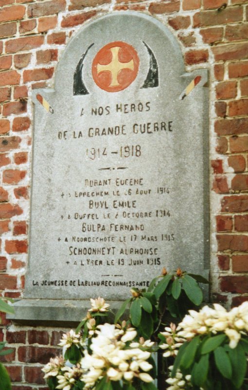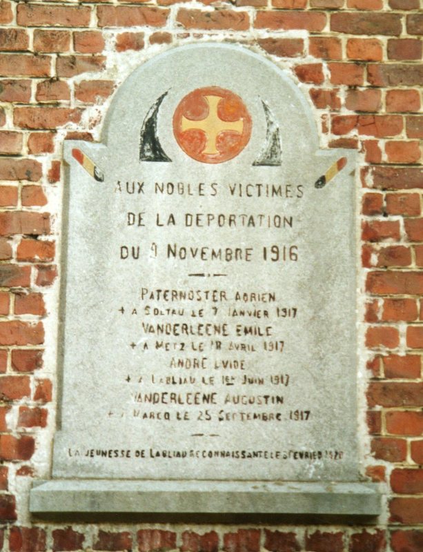 Localisation: Sur la façade de l'Église Sainte-Anne, Rue de Labliau. Coordonnées GPS: +50°40'00.84", +3°59'23.96". Inscription figurant sur les stèles Stèle de gauche "À NOS HÉROS DE LA GRANDE GUERRE 1914 - 1918 [Quatre noms, non classés par ordre alphabétique] LA JEUNESSE DE LABLIAU RECONNAISSANTE LE 6 FÉVRIER 1920" Stèle de droite "AUX NOBLES VICTIMES DE LA DÉPORTATION DU 9 NOVEMBRE 1916 [Quatre noms, non classés par ordre alphabétique] LA JEUNESSE DE LABLIAU RECONNAISSANTE LE 6 FÉVRIER 1920" Voir les noms gravés sur ces stèles |