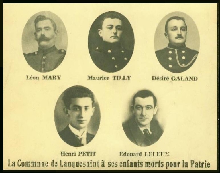 Localisation de ce monument: Collection privée Inscription figurant sur le monument "[Cinq photos avec nom et prénom] LA COMMUNE DE LANQUESAINT À SES ENFANTS MORTS POUR LA PATRIE" Plus d'informations concernant ces personnes |