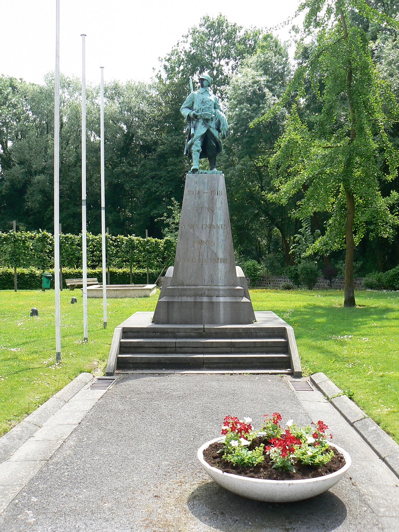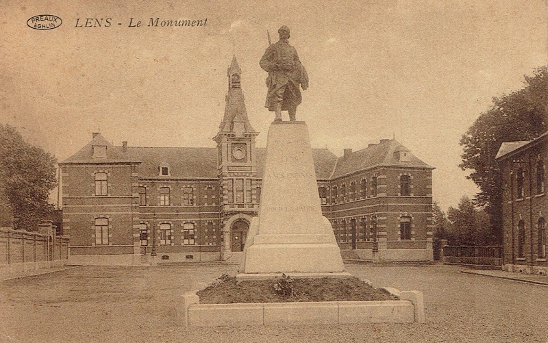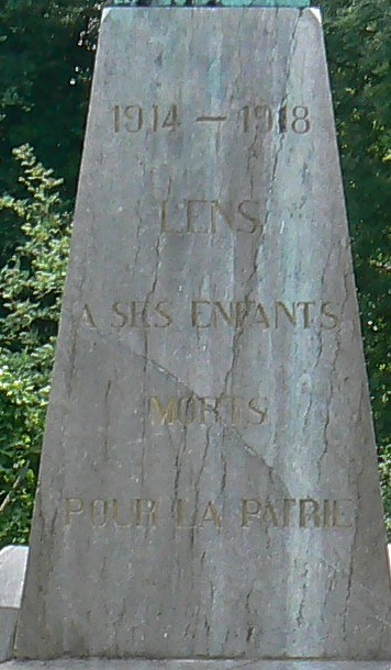 Localisation: Place de la Trinité, à droite de l'ancienne maison communale, le long de la Dendre orientale. Comme on pourra le constater à la lecture des cartes postales anciennes ci-dessous, le monument se trouvait auparavant au centre de cette même Place de la Trinité. Coordonnées GPS: +°33'21.2", +3°54'10.5" Inscriptions figurant sur le monument Face avant "1914 - 1918 LENS À SES ENFANTS MORTS POUR LA PATRIE" Face latérale 1 "COMBATTANTS MORTS AU CHAMP D'HONNEUR [Quatre noms, classés par ordre alphabétique]" Face latérale 2 "CIVILS VICTIMES DE LA DÉPORTATION [Huit noms, classés par ordre alphabétique] VICTIMES DES FAITS DE GUERRE [Deux noms, classés par ordre alphabétique]" Inauguration: Dimanche 10 juin 1923. Voir les noms gravés sur le monument |