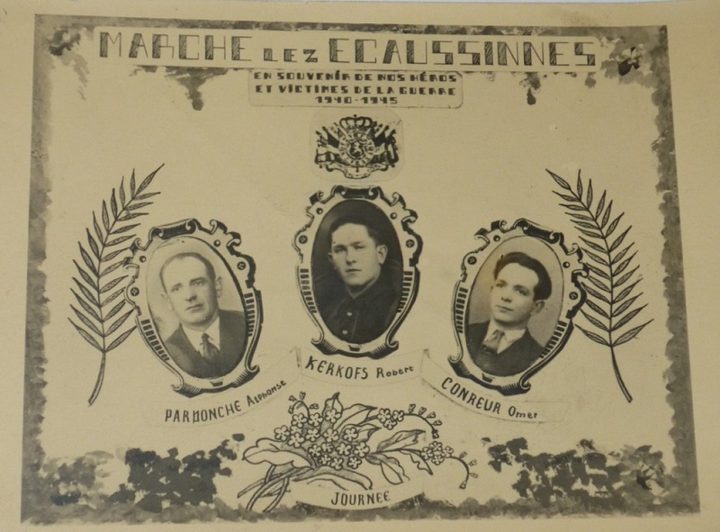 Localisation: Collection privée. Inscriptions "MARCHE LEZ ECAUSSINNES EN SOUVENIR DE NOS HÉROS ET VICTIMES DE LA GUERRE 1940-1945 [Trois noms, avec photo, non classés par ordre alphabétique] JOURNÉE" Voir les noms mentionnés sur le document |
