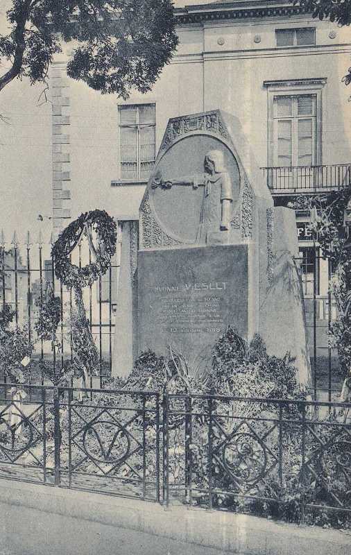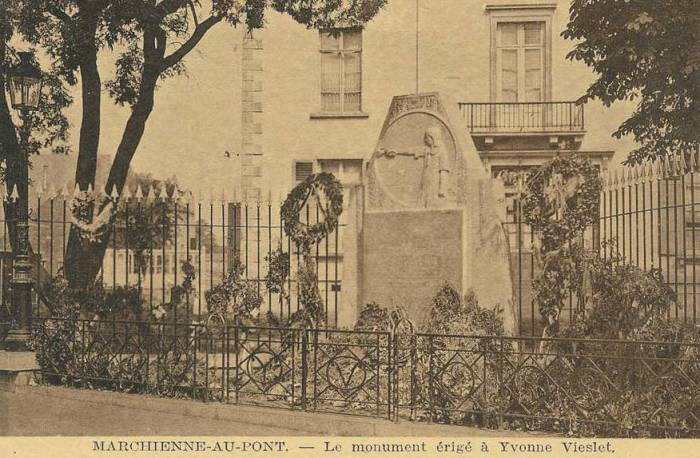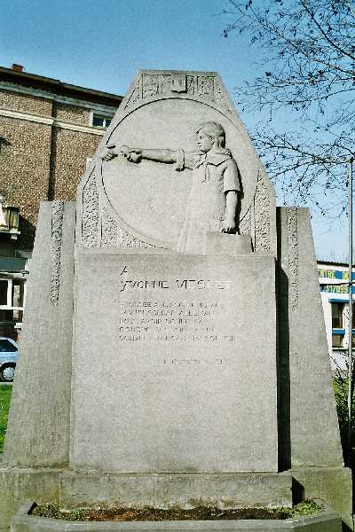Localisation de ce monument: Rue de Châtelet. Inscriptions sur le monument Face avant "À YVONNE VIESLET FUSILLÉE À L'ÂGE DE 10 ANS PAR UN SOLDAT ALLEMAND POUR AVOIR DONNÉ SA COUQUE SCOLAIRE À UN SOLDAT FRANÇAIS PRISONNIER LE 12 OCTOBRE 1918" Face arrière "CE MONUMENT A DÛ ÊTRE ENLEVÉ EN 1940 PAR ORDRE DE L'AUTORITÉ ALLEMANDE PARCE QUE JUGÉ INJURIEUX POUR L'ALLEMAGNE À YVONNE VIESLET FUSILLÉE À L'ÂGE DE 10 ANS PAR UN SOLDAT ALLEMAND POUR AVOIR DONNÉ SA COUQUE SCOLAIRE À UN SOLDAT FRANÇAIS PRISONNIER LE 12 OCTOBRE 1918 ÉRIGÉ PAR SOUSCRIPTION PUBLIQUE À L'INITIATIVE DE LA F.N.C. SECTION DE MARCHIENNES" Ce monument a été érigé à l'endroit précis où fut abattue Yvonne VIESLET le 12 octobre 1918. Pour d'autres photos d'Yvonne VIESLET ou des monuments qui lui ont été consacrés, consulter le site suivant: http://www.1914-1918.be/enfant_vieslet.php Voir les informations sur cette personne enregistrées dans la base de données |