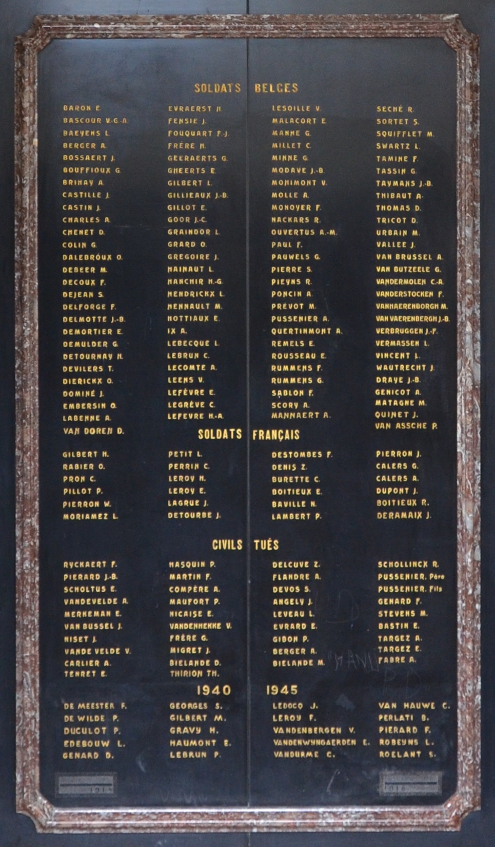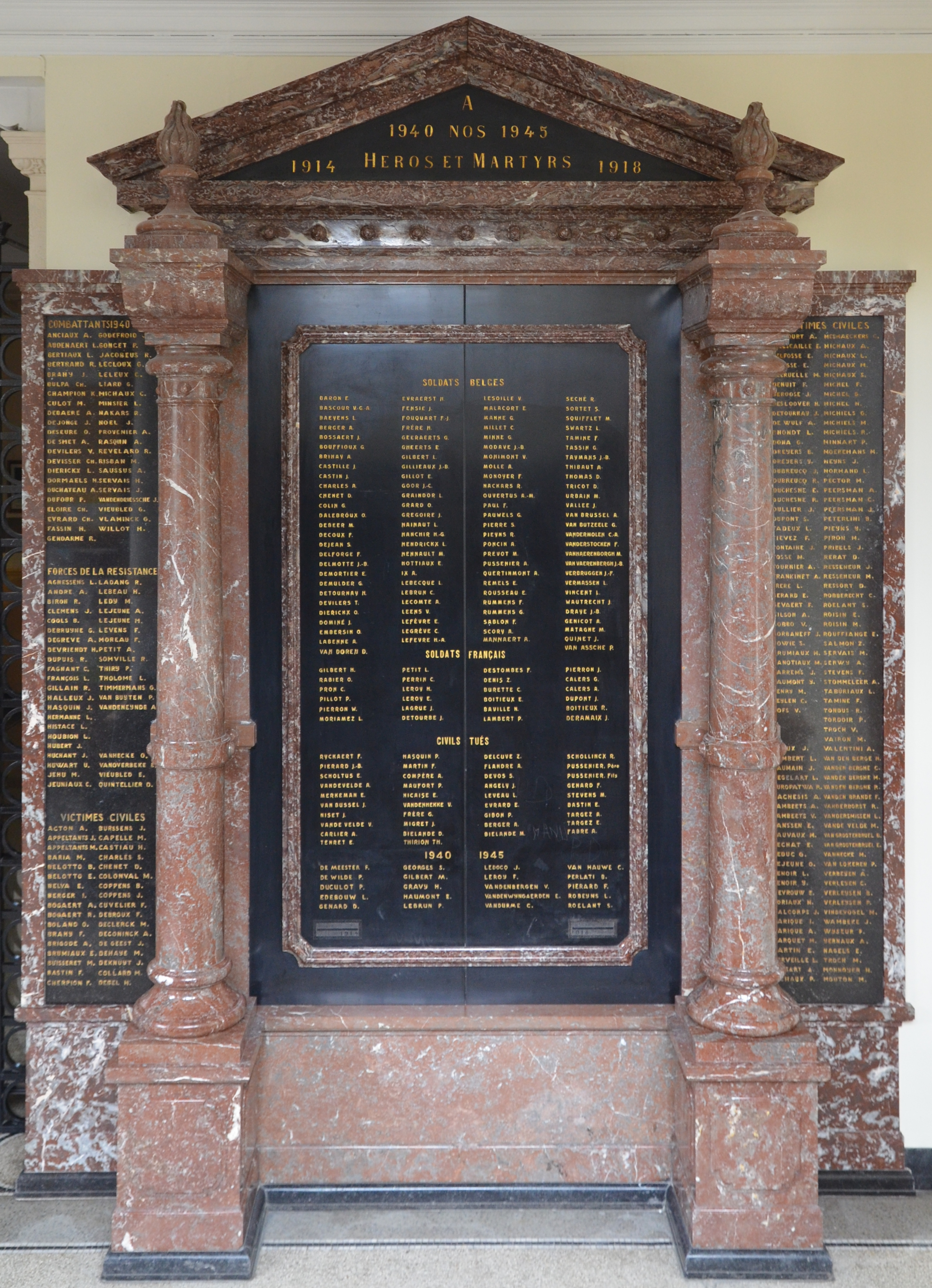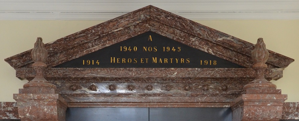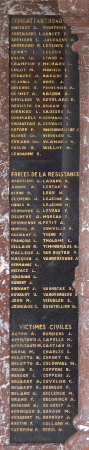 Localisation: À l'intérieur de l'Hôtel de Ville, place ALBERT 1er. Coordonnées GPS : +50°24'00.8", +4°28'51.2" Inscriptions figurant sur le monument: "À 1940 NOS 1945 1914 HÉROS ET MARTYRS 1918 " Voir les noms mentionnés sur ce monument Un souvenir pieux mentionne le nom d'une victime civile supplémentaire tuée dans un bombardement de Montignies-sur-Sambre en février 1944. Il s'agit de Maria SOMERS. Il nous a paru opportun d'ajouter son nom à la liste des victimes de guerre à Montignies-sur-Sambre. |