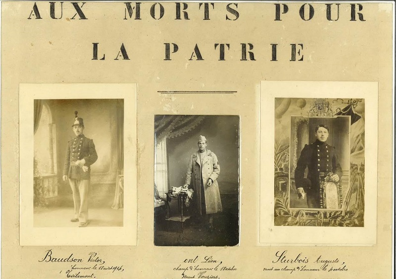 Localisation: Document reçu de David LAVAUX. Inscriptions "AUX MORTS POUR LA PATRIE [Trois noms, classés par ordre alphabétique, avec mention des date et lieu de décès]" Plus d'informations concernant les soldats mentionnés sur le document |