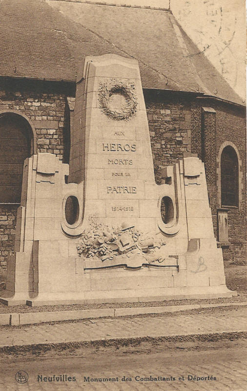 Localisation de ce monument: Place Louis Lefèbvre, au pied de l’église Saint-Nicolas. Coordonnées GPS: +50°34'04.84", +4°00'08.46" Inscriptions figurant sur le monument Face avant "AUX HÉROS MORTS POUR LA PATRIE 1914 - 1918" Face arrière "NEUFVILLES À SES HÉROÏQUES COMBATTANTS MORTS [Quatorze noms, classés par ordre alphabétique sauf le premier et les trois derniers] À SES VICTIMES DE LA BARBARIE [Dix-neuf noms, sur deux colonnes, classés par ordre alphabétique] DÉPORTÉS DÉCÉDÉS [Deux noms, non classés par ordre alphabétique] RÉSISTANTS MORTS POUR LA PATRIE 1940 - 1945 [Trois noms, classés par ordre alphabétique]" Informations complémentaires sur le monument: Il est réalisé en pierre bleue de la carrière du Clypot à Neufvilles. Il a été inauguré en 1922. Voir les noms mentionnés sur le monument |