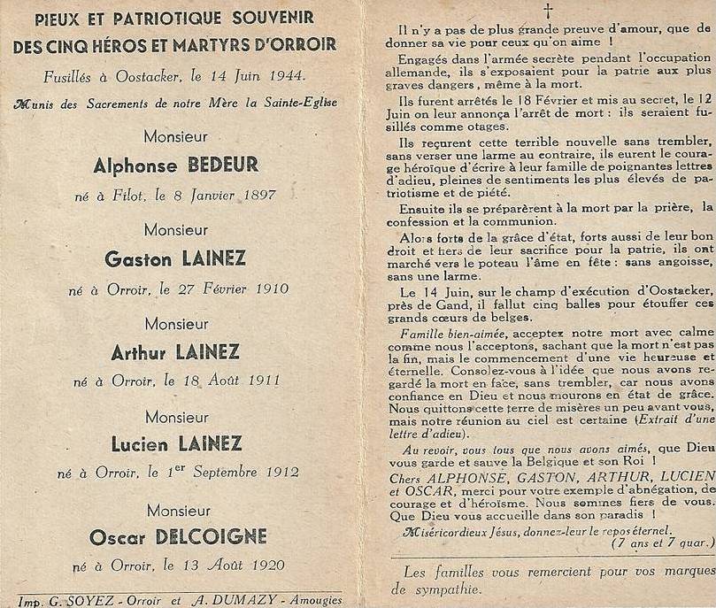 Localisation: collections privées. Inscription figurant sur le document "ORROIR À SES MARTYRS, MEMBRES DE LA RÉSISTANCE [Cinq noms, non classés par ordre alphabétique, avec photo et mention de la date de naissance ainsi que des lieu et date d'exécution]" Informations complémentaires Chaque année, le Drapeau éternel, qui flotte durant 365 jours, rappelle le souvenir des cinq jeunes résistants d'Orroir, fusillés le 14 juin 1944 par les Allemands à Oostakker. Le comité du Souvenir d'Orroir entend ranimer le "devoir de mémoire" quelque peu oublié. Quelques mots